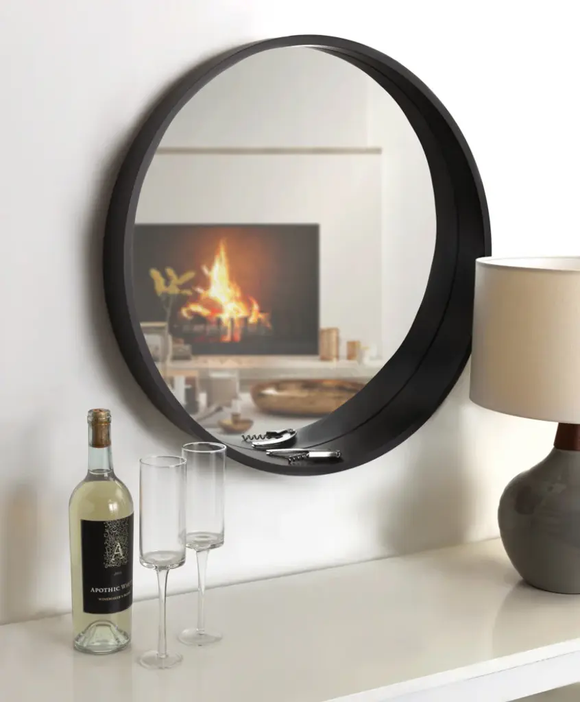 Create a beautiful, modern wall display in any room of your home with this beautiful Wheeler wall mirror from Kate and Laurel. This mirror offers your home a trendy, round shape, with a graduated profile depth that offers a chic catch-all for small items. Use this lower shelf as an area to store keys, small plants, jewelry, and more! The sleek, modern black finish and round shape create a sophisticated wall décor item that catches the eye without overshadowing your other décor pieces. If you have a smaller space in your home that needs a bit of an expansion, a mirror is a great way to spread light sources and create dimension throughout your home. With metal D-ring hangers, you can hang this mirror in seconds in any modern living room, entry, bedroom, bathroom, or kitchen. If you want a unique, out-of-the-box wall display, purchase multiples and hang in a symmetrical or staggered formation. This mirror is the perfect way to bring any décor aesthetic into the chic 21st century. • LARGE WALL MIRROR: The Wheeler wall mirror features a 24 inch diameter to give your home an eye-catching accent piece that doesn''t overshadow your home décor• RAISED PROFILE: Use the robust, 3.5 inch depth shelf for storage of keys and small catch-all items in your entryway or living room• SLEEK FINISH: This mirror features a contemporary round shape and a smooth black finish that offers a transitional yet modern look• DECORATIVE AND PRACTICAL: Use this beautiful mirror to spread more light throughout your home and bring dimension to your smaller spaces• EASY TO HANG: This mirror hangs in a matter of seconds with D-ring hangers attached to the back