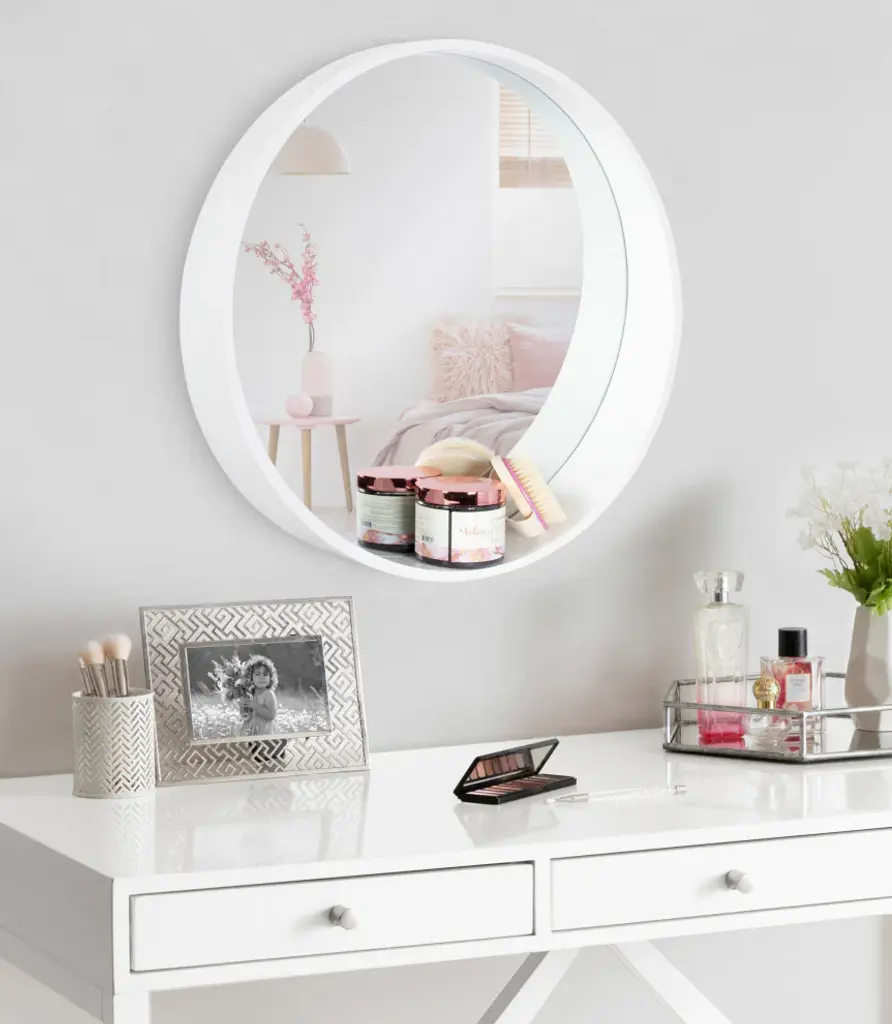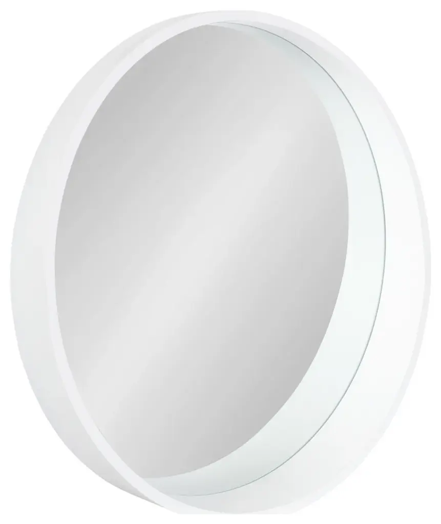 Create a beautiful, modern wall display in any room of your home with this beautiful Wheeler wall mirror from Kate and Laurel. This mirror offers your home a trendy, round shape, with a graduated profile depth that offers a chic catch-all for small items. Use this graduated shelf depth as an area to store keys, small plants, jewelry, and more! The sleek, modern white finish and round shape create a sophisticated wall decor item that catches the eye without overshadowing your other decor pieces. If you have a smaller space in your home that needs a bit of an expansion, a mirror is a great way to spread light sources and create dimension throughout your home. With metal D-ring hangers, you can hang this mirror in seconds in any modern living room, entry, bedroom, bathroom, or kitchen. If you want a unique, out-of-the-box wall display, purchase multiples and hang in a symmetrical or staggered formation. This mirror is the perfect way to bring any decor aesthetic into the chic 21st century.• LARGE WALL MIRROR: The Wheeler wall mirror features a 24 inch diameter to give your home an eye-catching accent piece that doesn''t overshadow your home decor• RAISED PROFILE: Use the robust, 3.5 inch deep shelf frame for storage of keys and small catch-all items in your entryway or living room• SLEEK FINISH: This mirror features a contemporary round shape and a smooth white finish that offers a transitional yet modern look• DECORATIVE AND PRACTICAL: Use this beautiful mirror to spread more light throughout your home and bring dimension to your smaller spaces• EASY TO HANG: This mirror hangs in a matter of seconds with D-ring hangers attached to the back