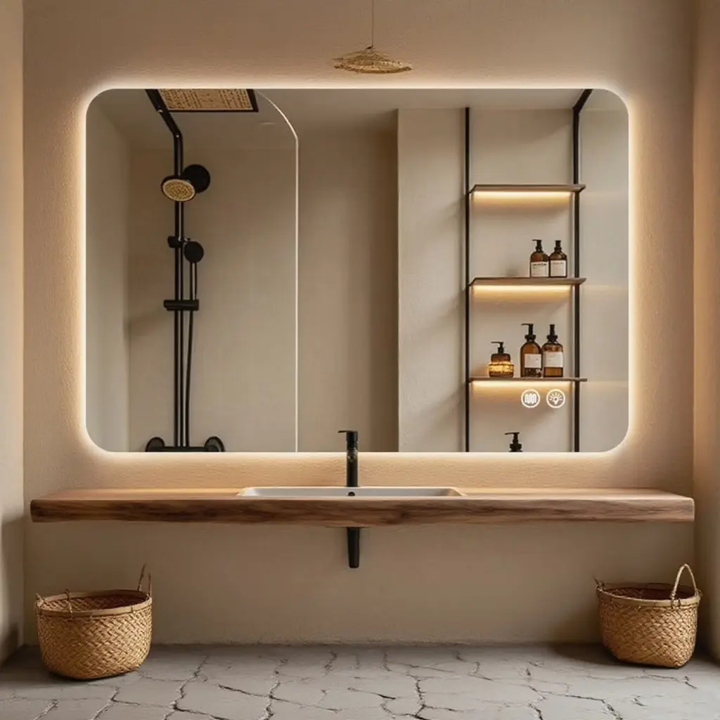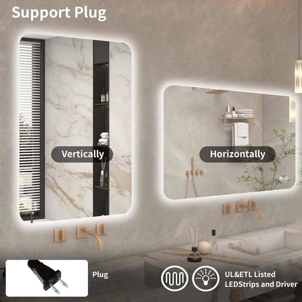 This elegantly designed LED bathroom mirror features a soft backlight that creates a warm and inviting ambiance while providing optimal illumination for makeup, shaving, and skincare routines. With three adjustable color temperatures—warm (3000K), natural (4000K), and white (6500K)—it delivers precise, distortion-free lighting with a high CRI of over 95 for true color accuracy. The advanced anti-fog technology ensures a clear reflection for up to an hour after showering, eliminating the need for manual wiping. A convenient memory function retains your last brightness and color settings, while the seamless waterproof construction guarantees long-lasting durability. Safety is prioritized with an explosion-proof film that prevents glass shattering. Flexible vertical or horizontal mounting options allow for customized installation to suit any bathroom decor. UL-certified for quality and reliability, this mirror combines functionality and modern elegance.