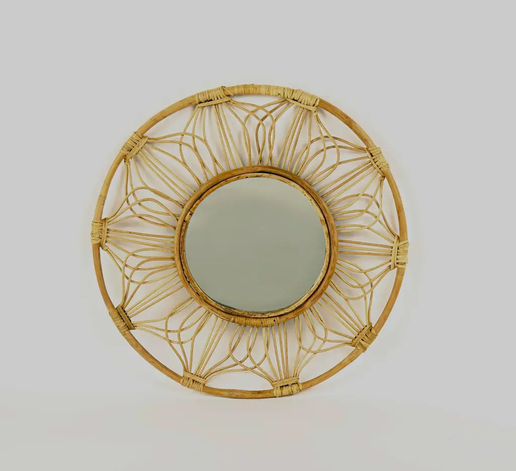 Add this unique handmade rattan hanging mirror to elevate any room in your home. Crafted with care and attention to detail, the round mirror seamlessly blends the warmth of nature with the elegance of artisan craftsmanship. This natural wall decor adds a touch of texture and minimalistic boho style to your space and serves as a decorative accent piece, perfect for your living room, bedroom, bathroom, and kid's room.