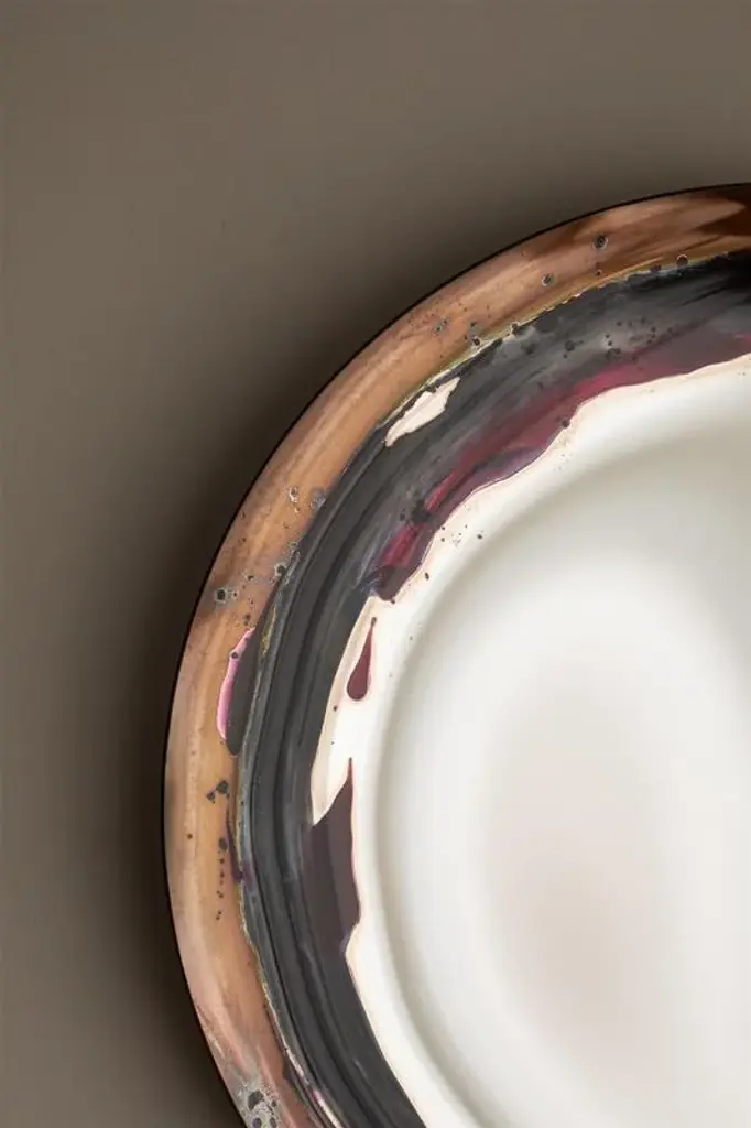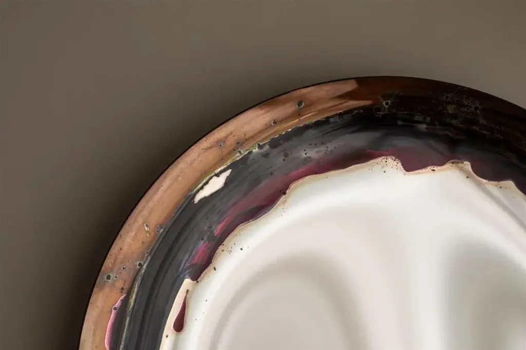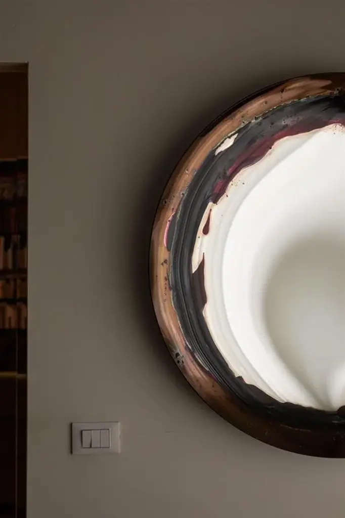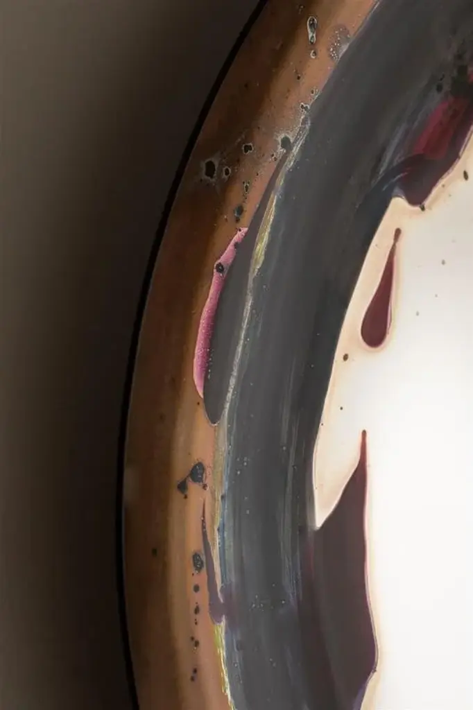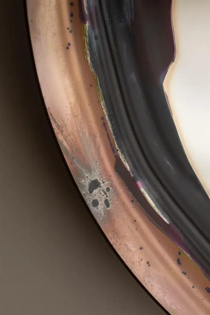 White Aura Wall Mirror by OOM Contemporary Glass Dimensions: Ø 95 cm. Materials: Copper luster and ceramic enamels on ultra-white glass, mixed techniques. Discover the Dome Collection, where glass artistry meets innovative design. This unique series features both plain and hand-painted curved mirrors, masterfully crafted using Murano Glass combined with ceramic enamels and metallic lusters. Drawing inspiration from the dynamic world of contemporary design, the Dome Collection redefines the boundaries of creativity and craftsmanship.