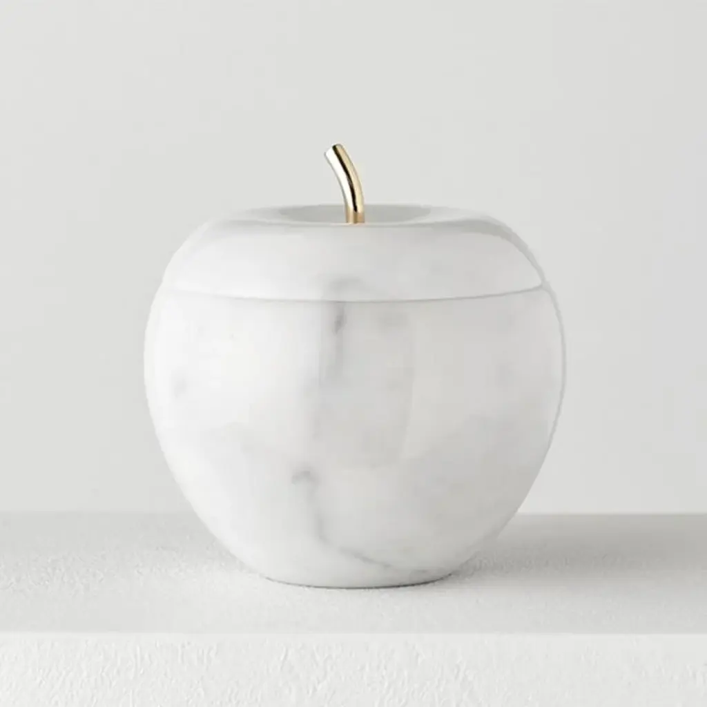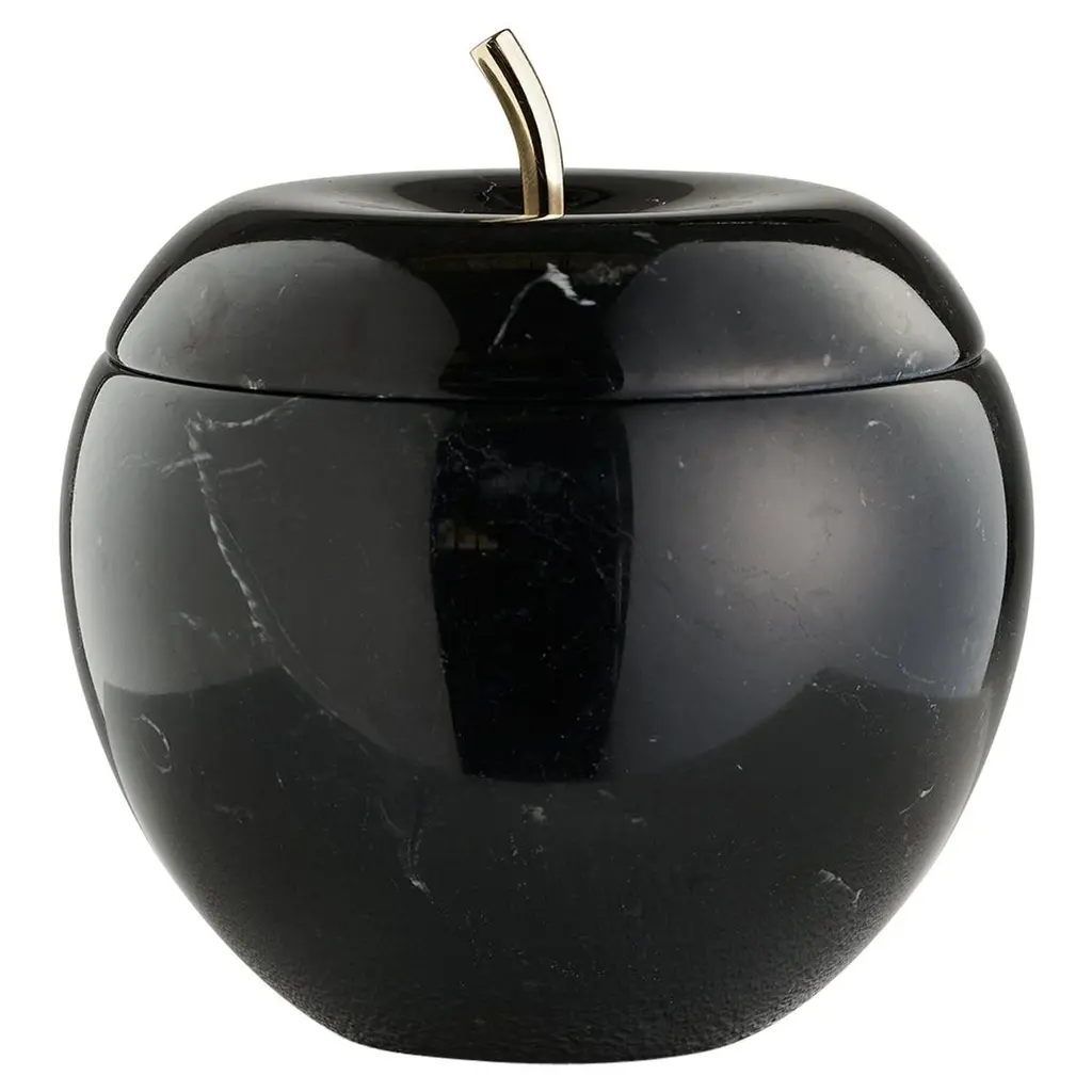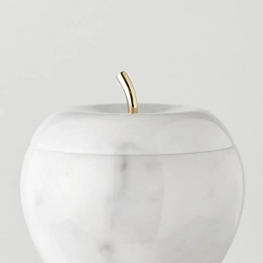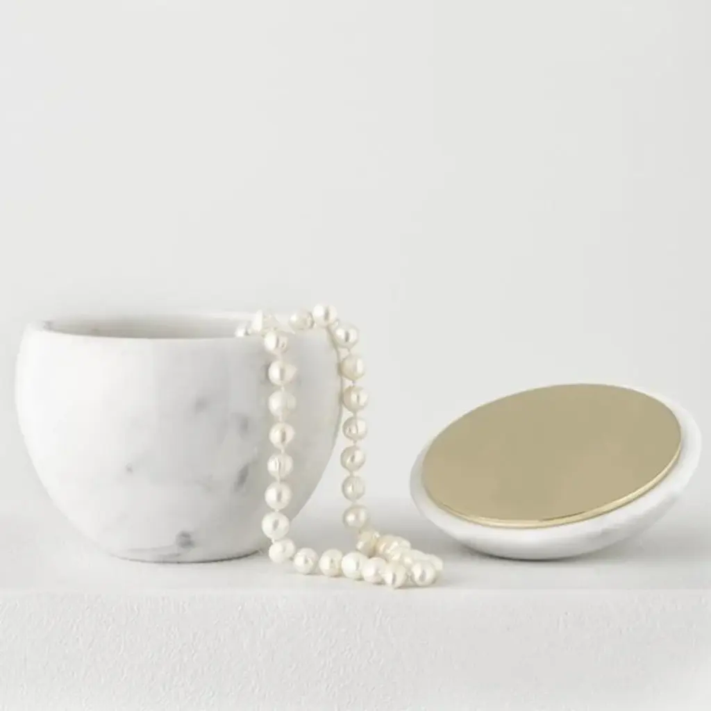 Box in glossy white Carrara marble, including a lid in brass mirror inside and a stalk in brass. Brass is Galvanized in gold 24 karat. Ø10xH11cm