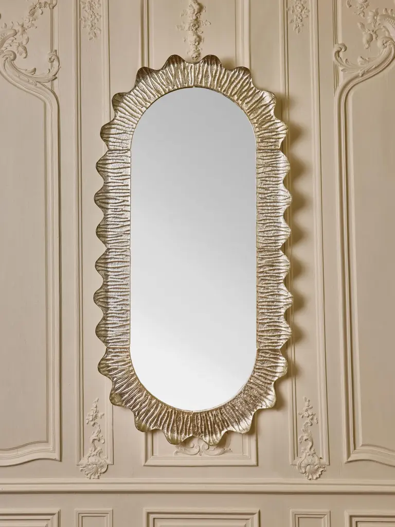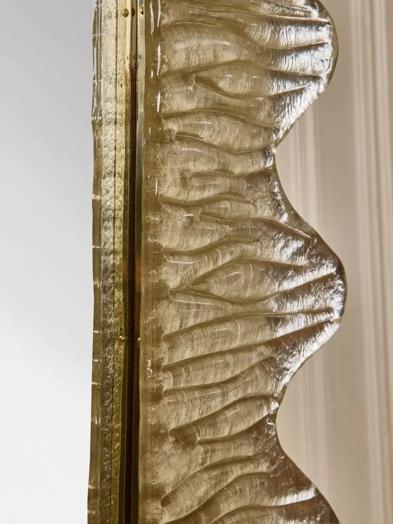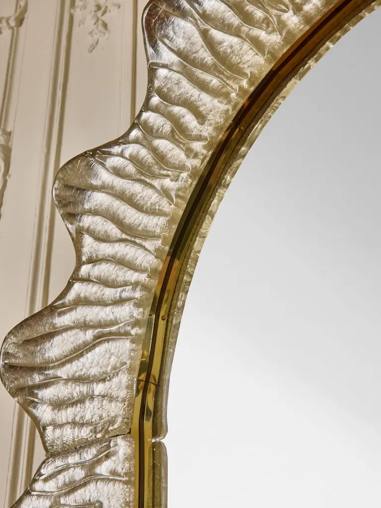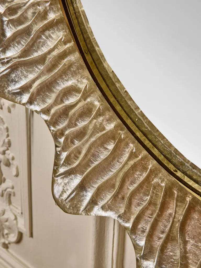 Oval mirror with frame in sculpted Murano glass, gilt with white gold leaf.Italy, 2024.