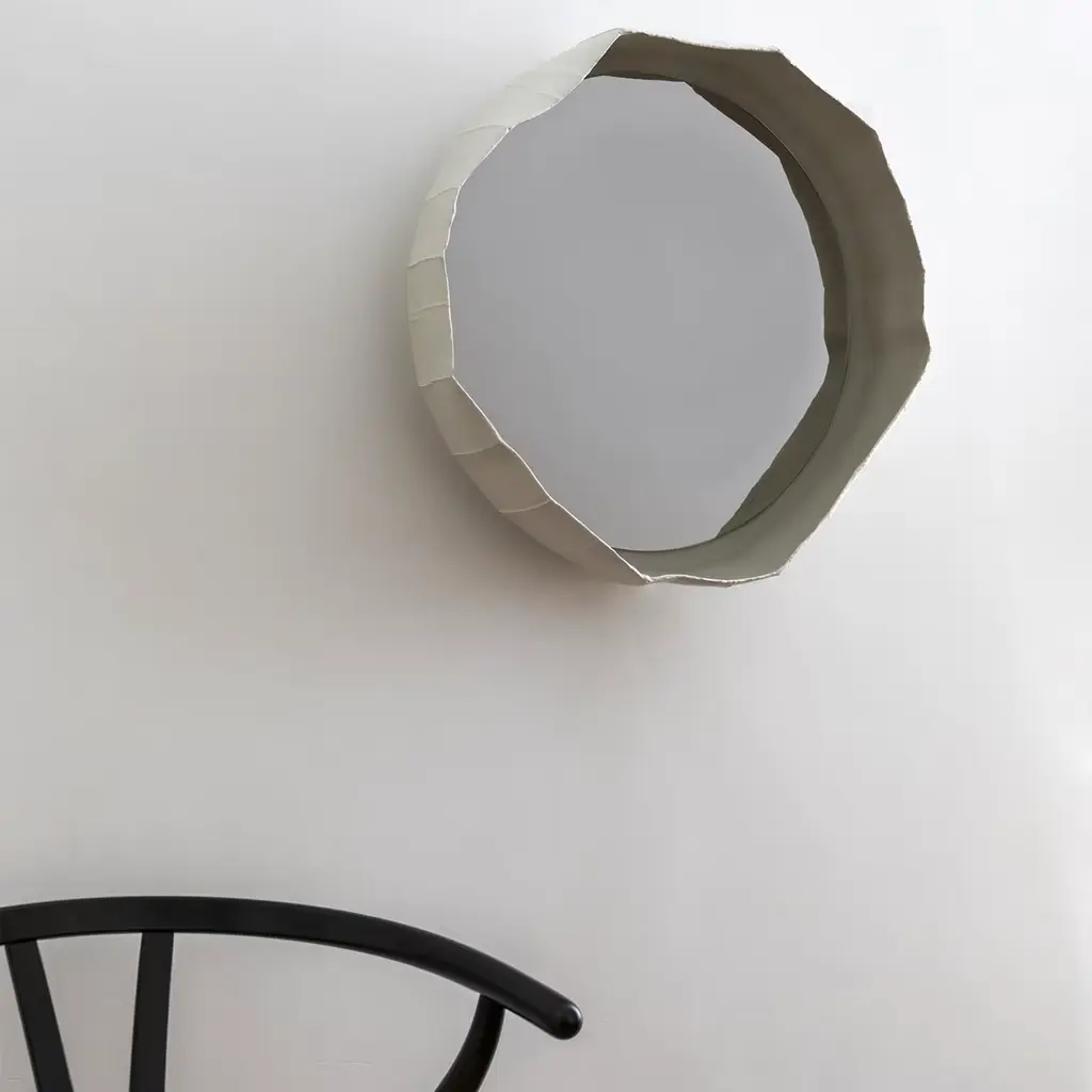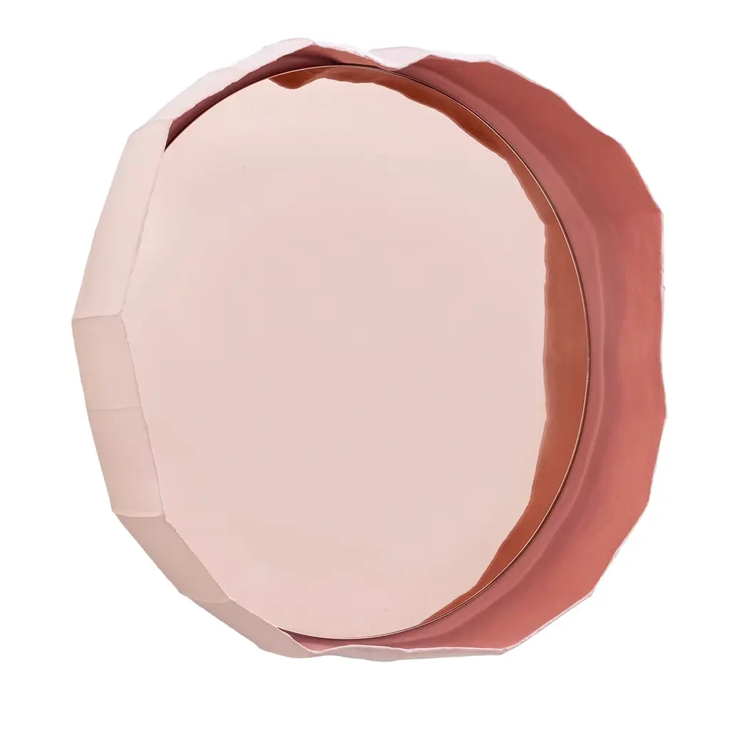 Handmade in Italy by Paola Paronetto & Giovanni Botticelli, this mirror merges ceramic with glass. Ninfea from reflections, a fusion of distinctive materials developed by their creators, unites an apparently light material such as paper clay with the crisp lines of the mirror. The result is a thoughtful and meticulous balance, warm and delicate. The chromatic harmony is purposeful and unites the two materials seamlessly. Available in an extensive palette of colours for bespoke requests.