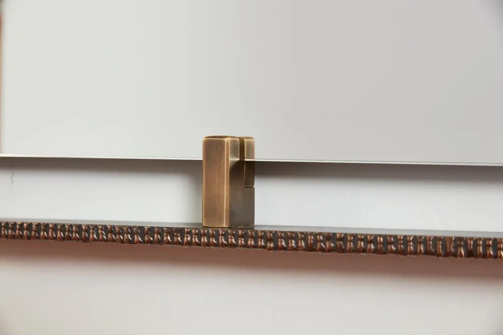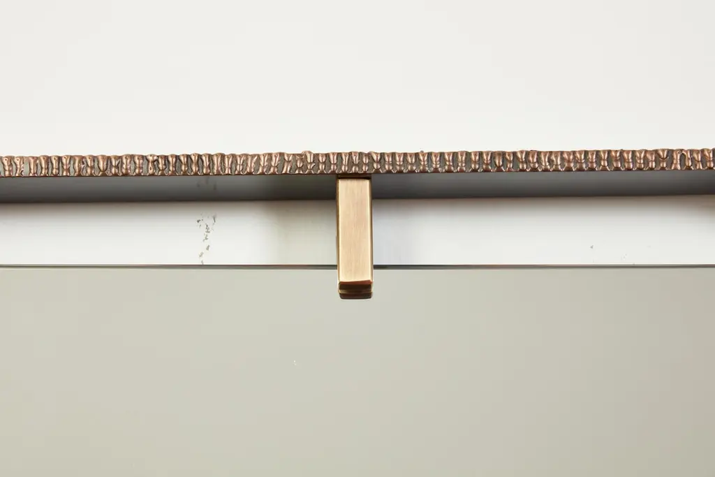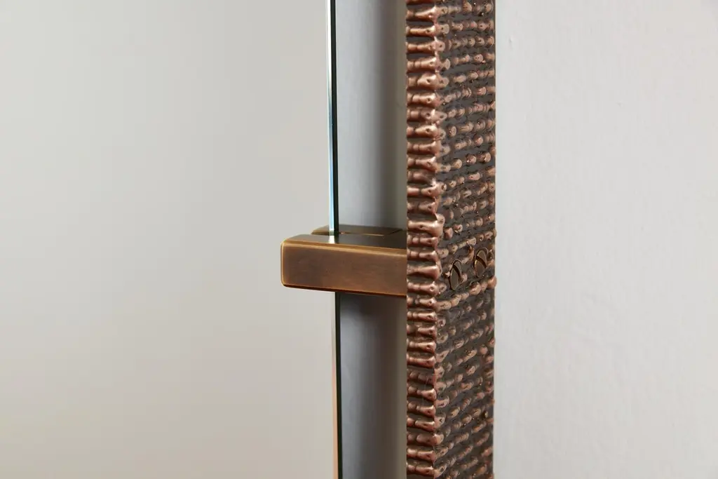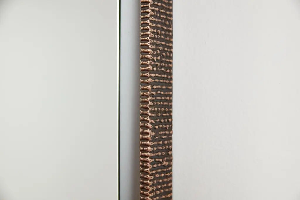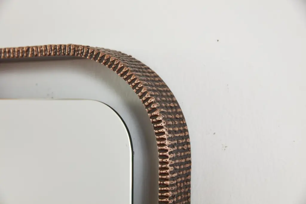 William Emmerson's brilliantly designed "Molten Racetrack Mirror" - handmade in Los Angeles, 2023.Artisanally crafted from robust steel and rich bronze, the mirror features a molten bronze cascading designed frame that appears frozen in time.Each mirror is handmade with undulating contours and lapping edges, thick bronze clasps and floating mirror.The marriage of steel, bronze, and molten metal exemplifies the harmonious blend of strength, elegance, and artistic expression. The mirror stands as a testament to the boundless possibilities that arise when contrasting elements unite, creating a visual spectacle that sparks the imagination and ignites a sense of wonder.Incredible attention to detail and a true art piece.Various shapes available - made to order.