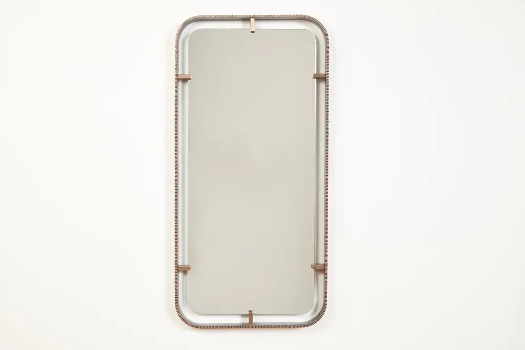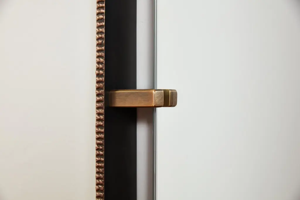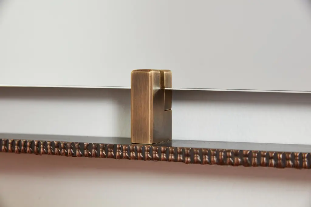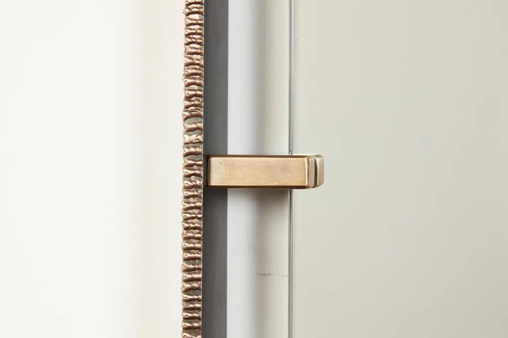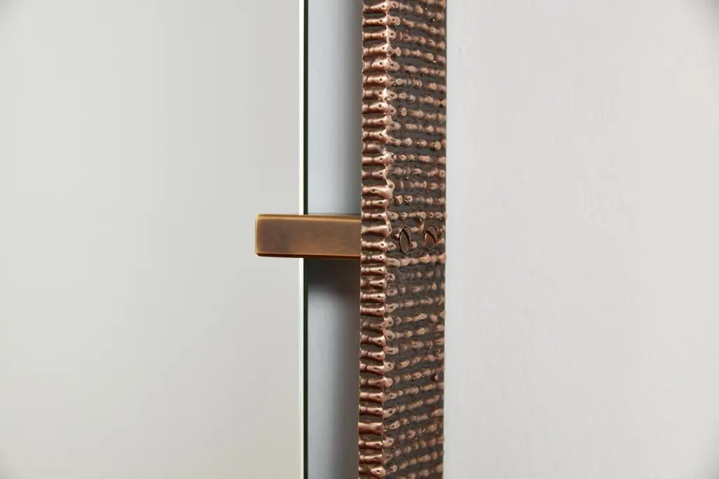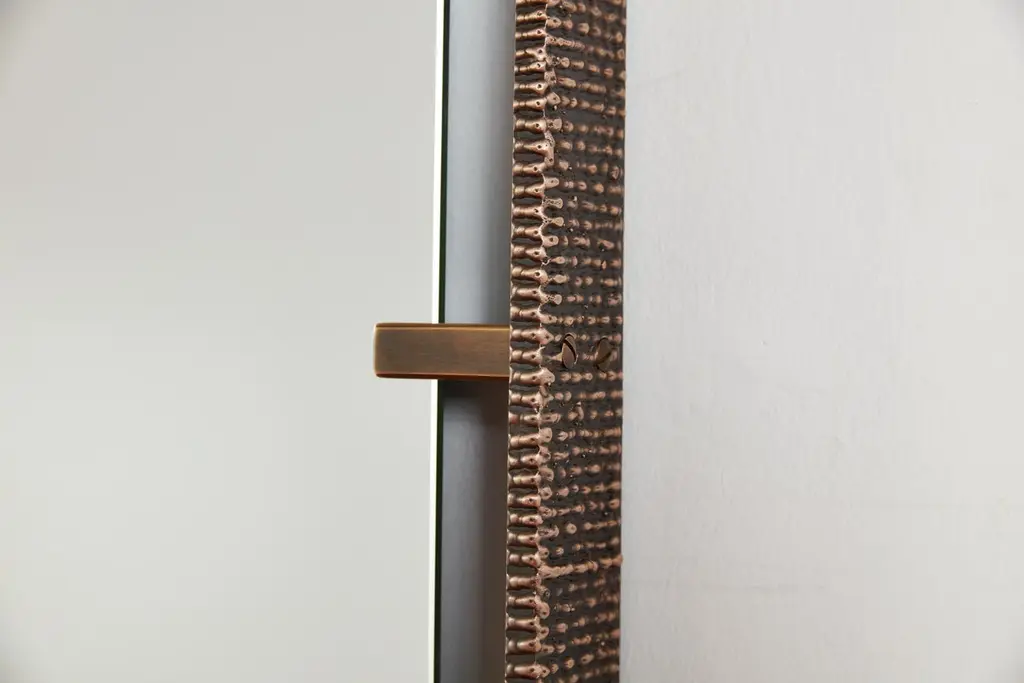 William Emmerson's brilliantly designed "Molten Racetrack Mirror" - handmade in Los Angeles, 2023.Artisanally crafted from robust steel and rich bronze, the mirror features a molten bronze cascading designed frame that appears frozen in time.Each mirror is handmade with undulating contours and lapping edges, thick bronze clasps and floating mirror.The marriage of steel, bronze, and molten metal exemplifies the harmonious blend of strength, elegance, and artistic expression. The mirror stands as a testament to the boundless possibilities that arise when contrasting elements unite, creating a visual spectacle that sparks the imagination and ignites a sense of wonder.Incredible attention to detail and a true art piece.Various shapes available - made to order.