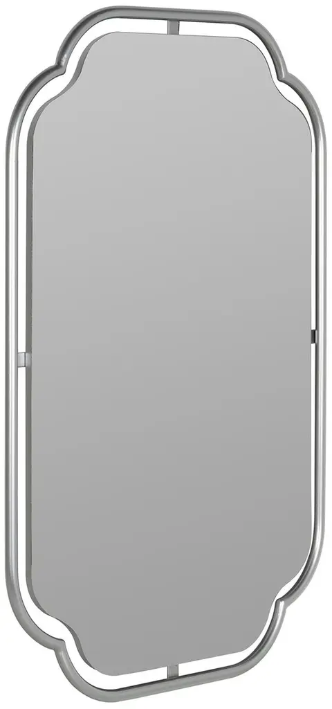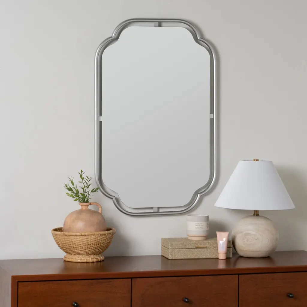 This scalloped wall mirror appears to float within its equally shapely silver frame. Statement-making on its own, it can also complement other elements in a gallery wall.