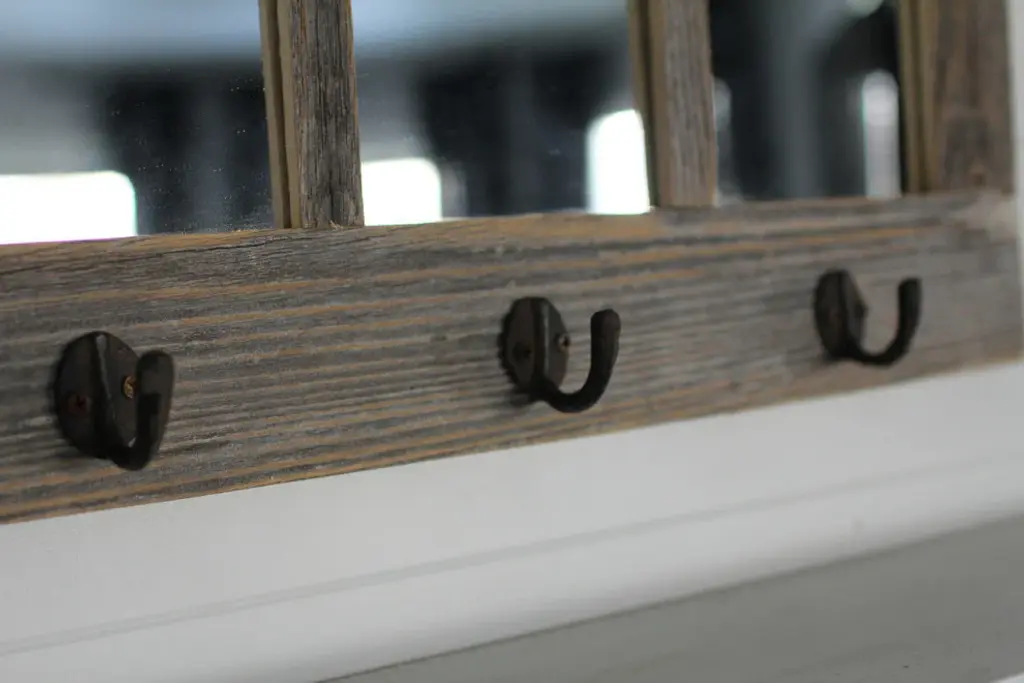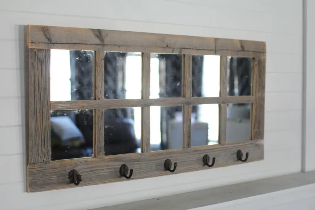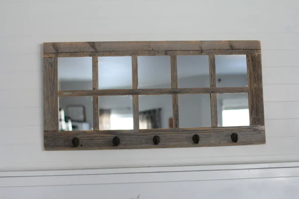 Made with 100% authentic reclaimed barnwood, this rustic windowpane mirror is perfect for any entryway or mudroom. 5 small hanging hooks are shipped attached to the mirror making it ready to hang as soon as you open the box. The mirror is also shipped with hanging hardware included. The mirror panes are 6 inches x 6 inches. Hanging hardware Included. 36.5 inches wide x 18 inches tall. Handmade in the USA. • PLEASE NOTE: Because of the possible variances in computer monitor colors and reclaimed wood colors, your completed wood frame may vary slightly in color and texture from the one you see pictured here.