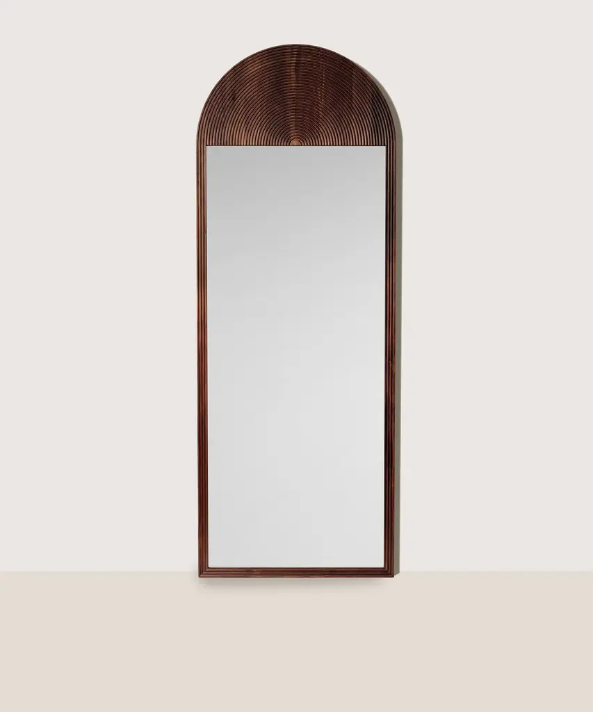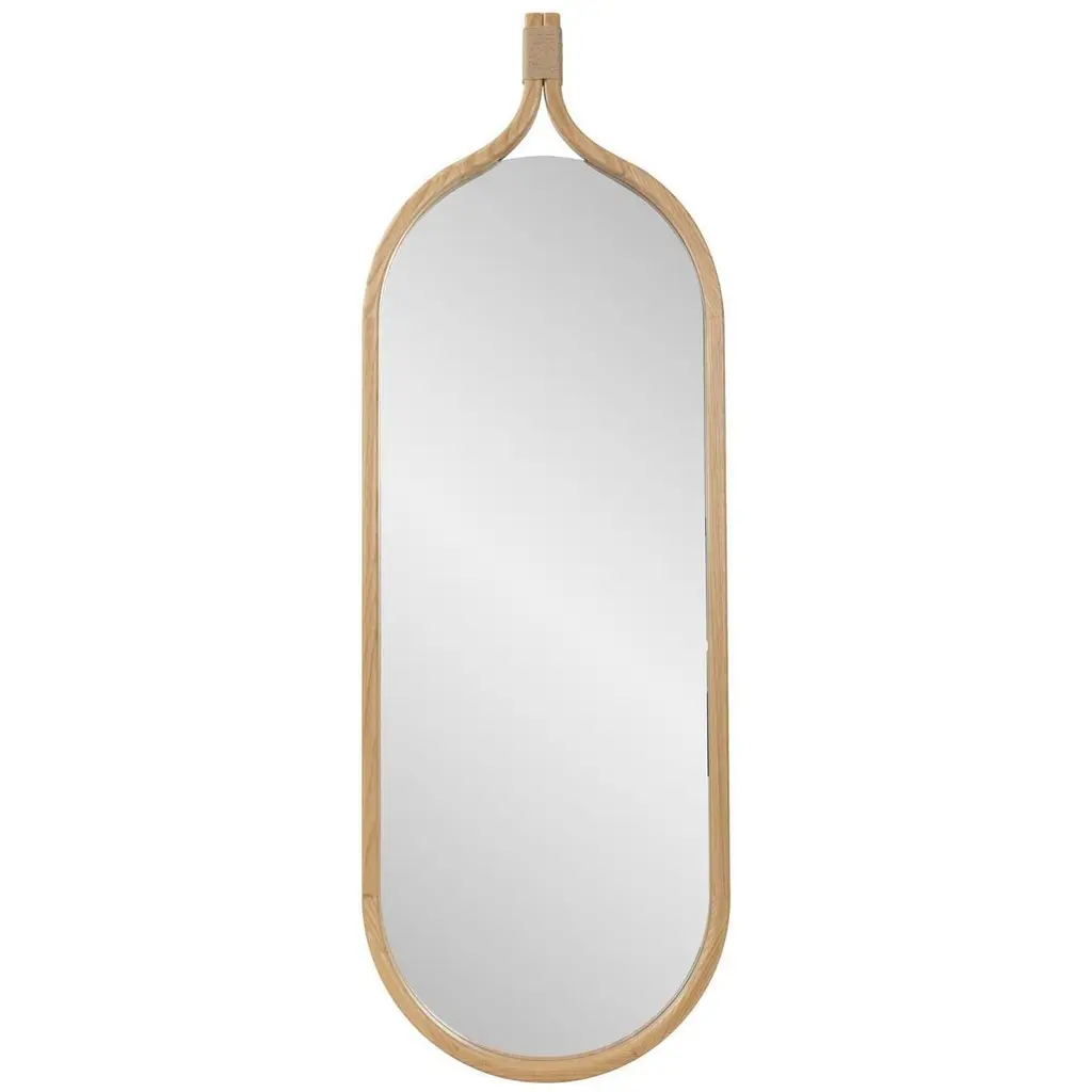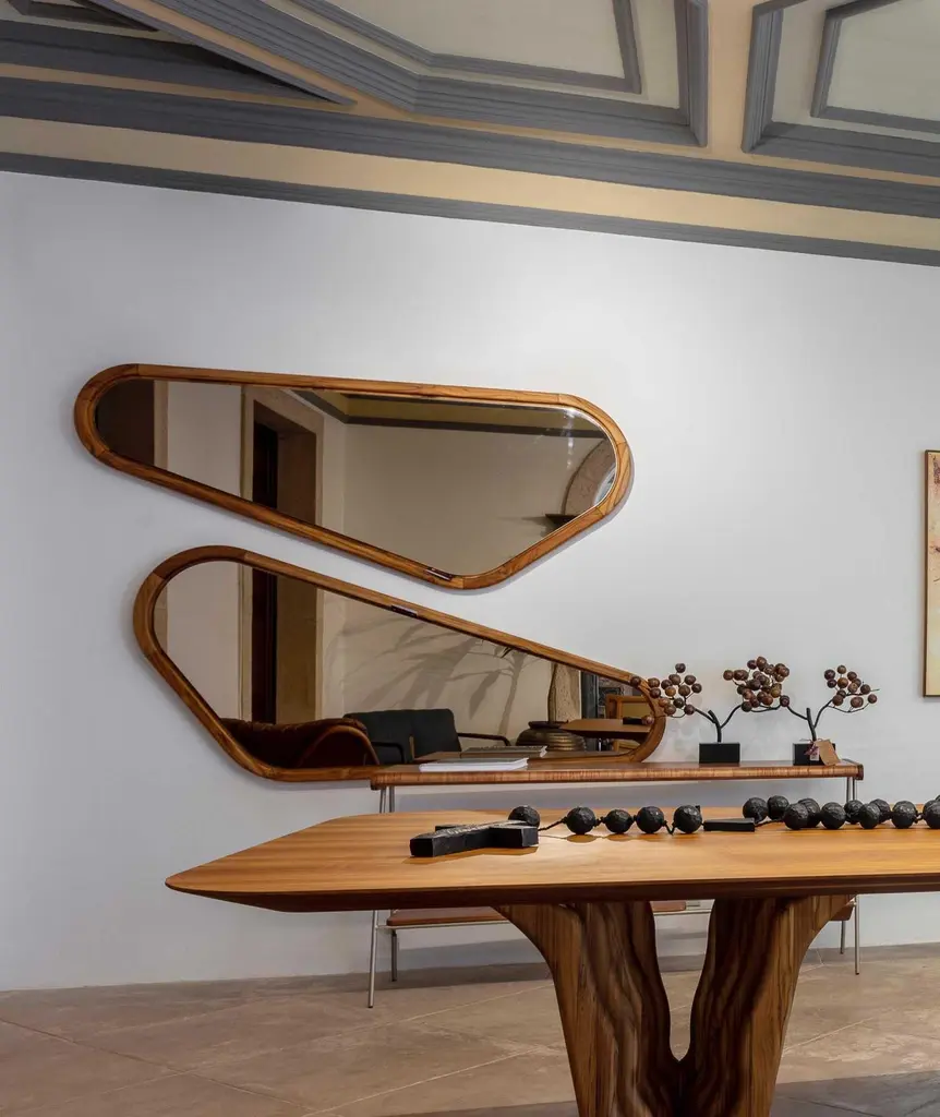 The Ali teak wood wall mirror by Studio + A! for Uultis embodies a perfect blend of lightness and elegance, bringing a touch of nature's beauty to any corner of your home. Named after the Italian word for ‘wings,’ the Ali mirror series is designed to evoke a sense of movement and freedom. When displayed together, the mirrors resemble soaring wings, creating a dynamic visual effect that enhances any decor. Crafted from high-quality teak wood, known for its durability and rich natural grain, each mirror features a solid wood frame, complemented by an MDF backing for added stability.Available individually or as a set, the Ali mirrors are a testament to Uultis' commitment to sustainable design, utilizing eco-friendly materials and responsible manufacturing practices. The warm teak wood finish offers natural variations, ensuring each mirror remains a unique work of art.The mirror for sale is the left one when they are displayed together, contributing to the distinctive wing-like shape. Fully assembled upon arrival, this mirror is ready to grace your living room, hallway, or bedroom, serving as a striking focal point or a complementary accent. Perfect for contemporary, minimalist, or organic modern interiors, the Ali wall mirror adds depth and elegance to any space, reflecting both light and artistic flair. Whether displayed individually or paired to create a wing-like silhouette, the Ali Teak Wood Mirror elevates your home with its timeless charm and versatility.
