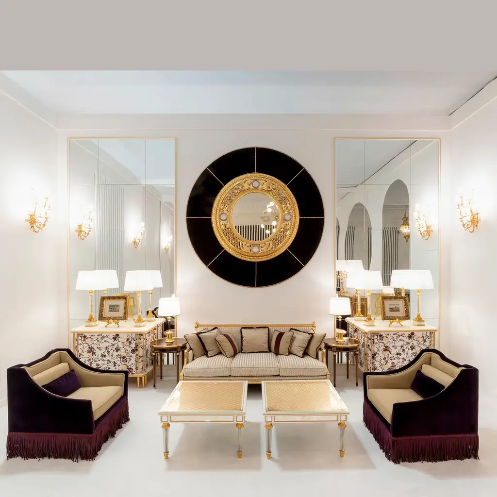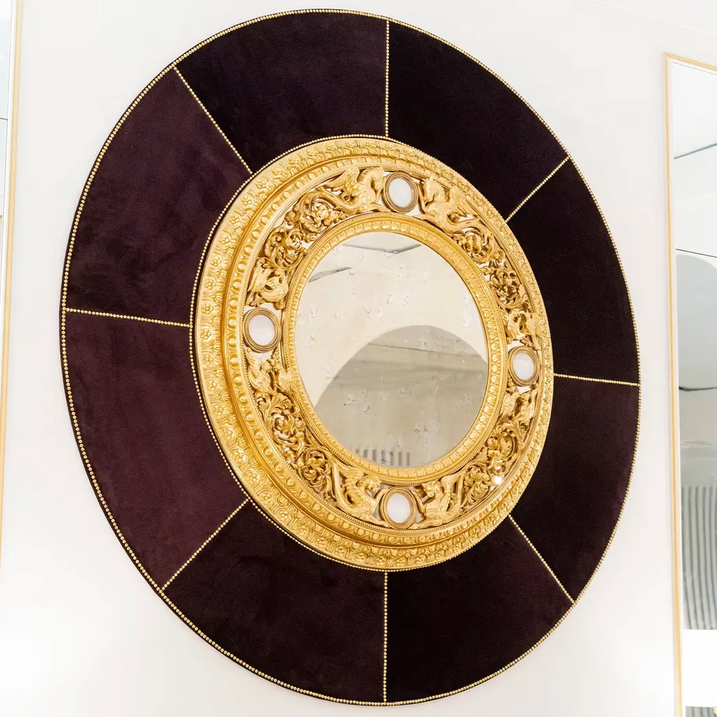A sublime display of traditional craftsmanship, this gorgeous mirror is finely carved by hand from wood in a classic ornamental motif enclosing a central antiquated Vienna mirror and is completed with 24K gold-plated bronze details, gold leaf finishes, and a refined velvet cover.