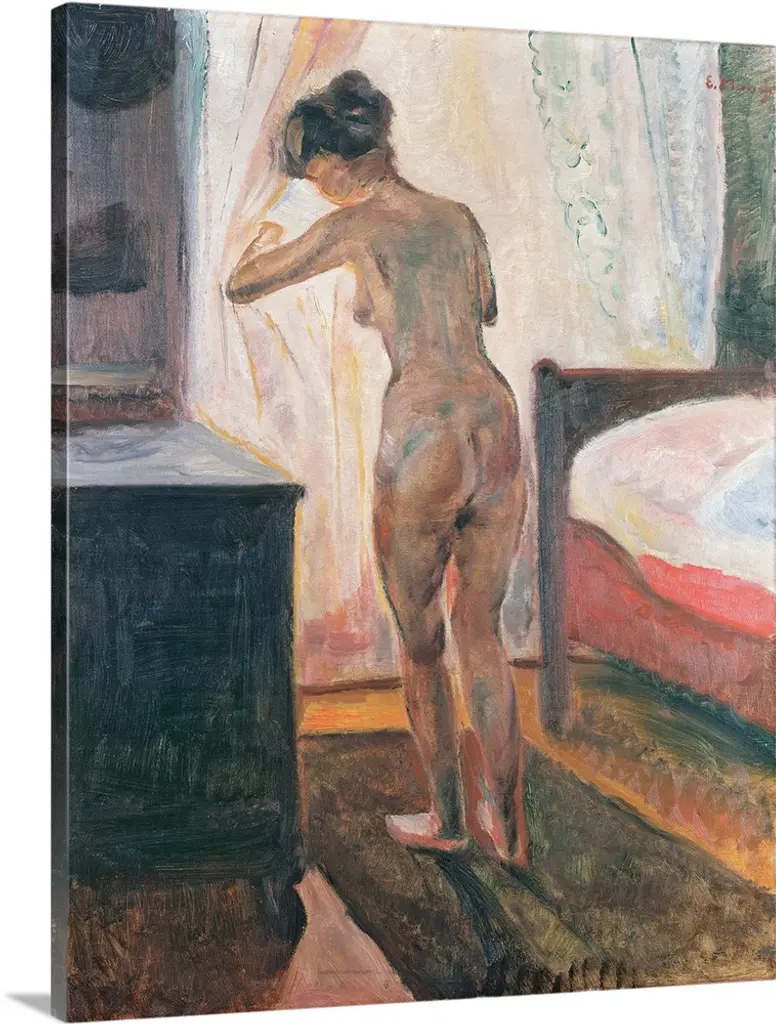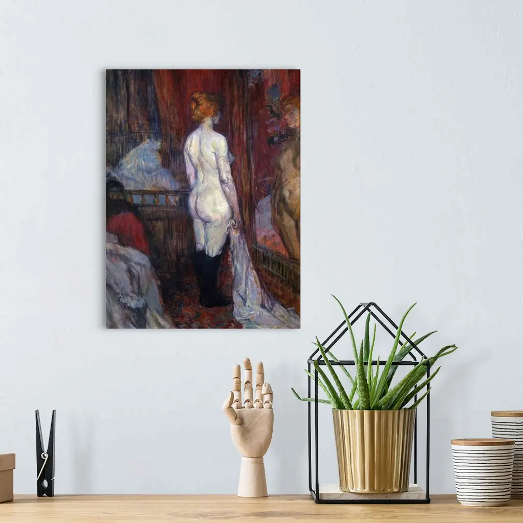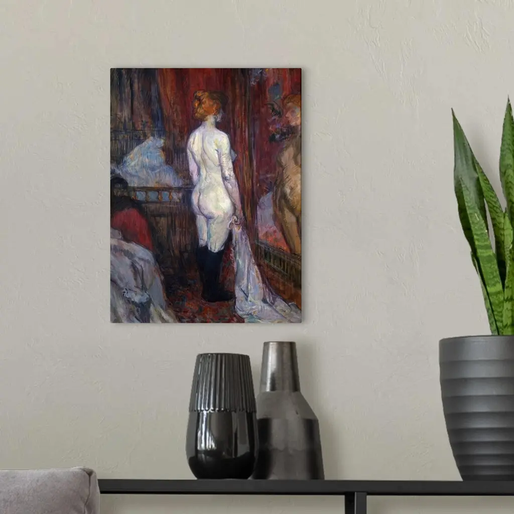 The indolent, cloistered lives of prostitutes were the subject of some of Lautrec's most powerful works. He made about fifty paintings depicting them, as well as numerous drawings and prints, including a suite of color lithographs, Elles, which was completed the year before this painting. Lautrec does not flatter the woman's naked figure, nor does he divulge the expression she sees in her mirror: she appears simply to be taking a stark appraisal of herself.