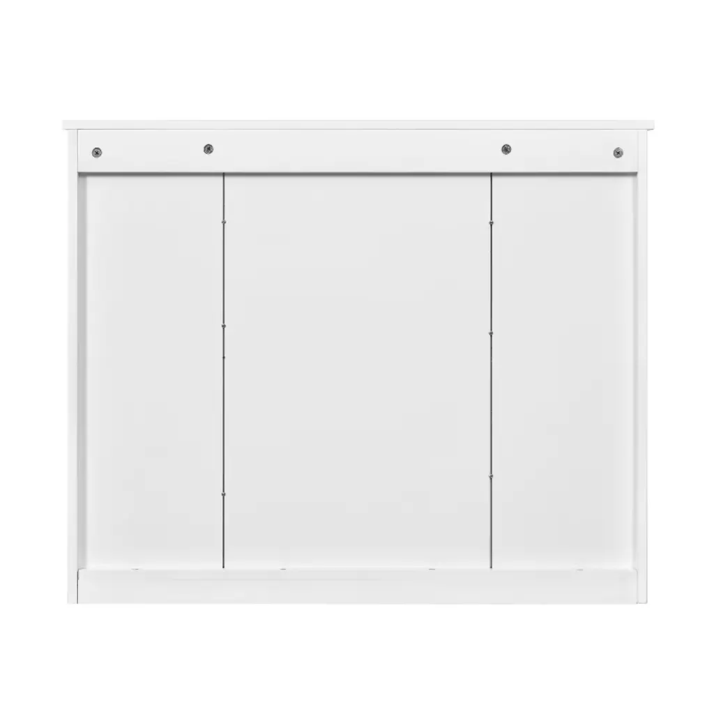 This wall-mounted bathroom cabinet features a mirrored door and four spacious shelves, offering both storage and functionality in one sleek design. The versatile unit maximizes vertical space above toilets or on empty walls while keeping essentials neatly organized. Its mirrored surface provides a practical grooming station while enhancing the room's brightness and sense of space.