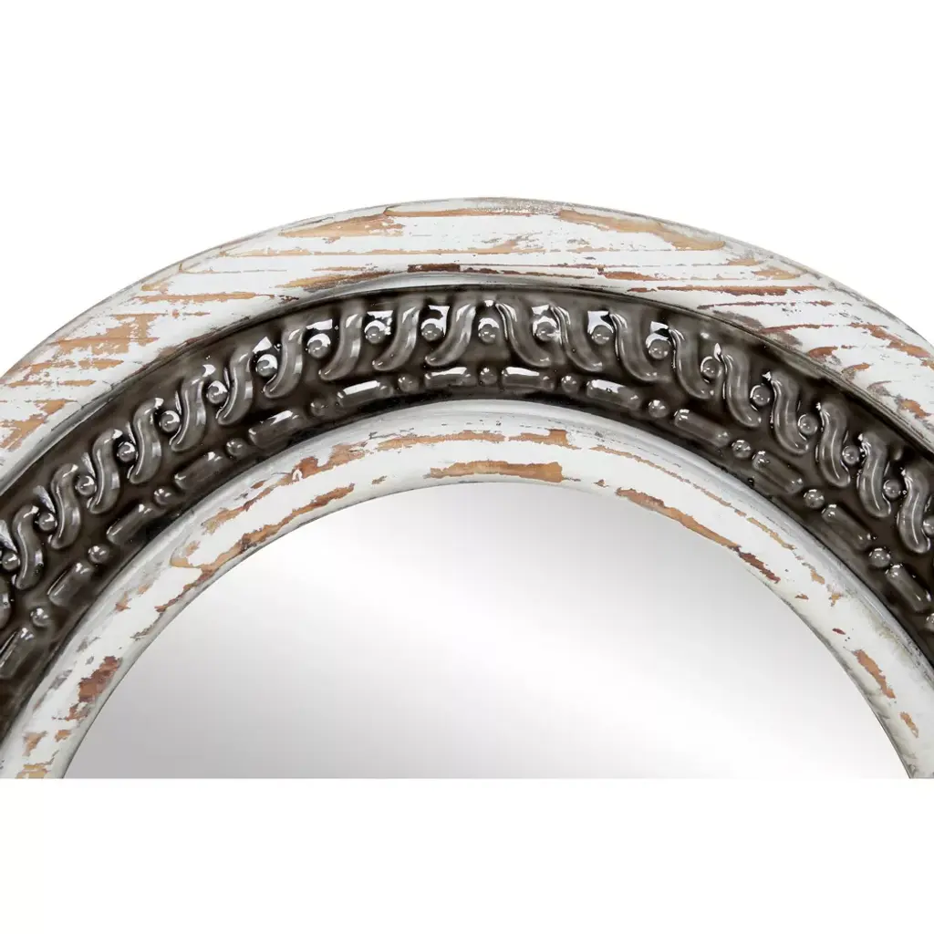 Complements vanilla and dark neutral-toned walls to flatter the mirror's baroque iron inlay detail and natural distressed white finish. This item ships in 1 carton. Can be hung vertically using the D-rings on the back; nails and screws not included. Suitable for indoor use only. This item ships fully assembled in one piece. This is a single white colored entryway mirror. Farmhouse style.