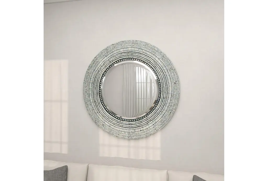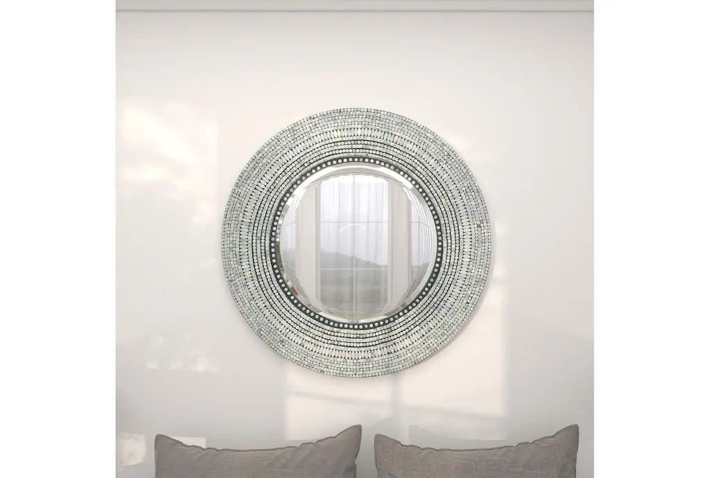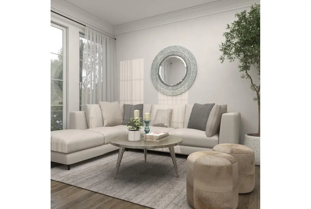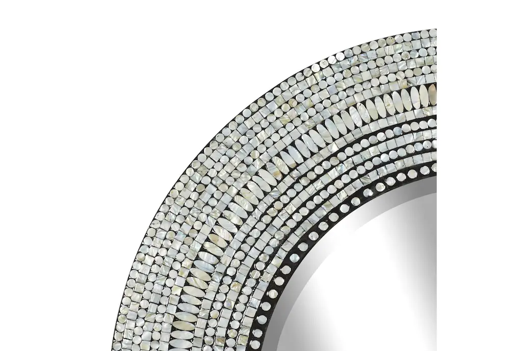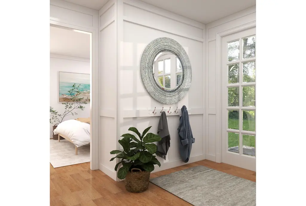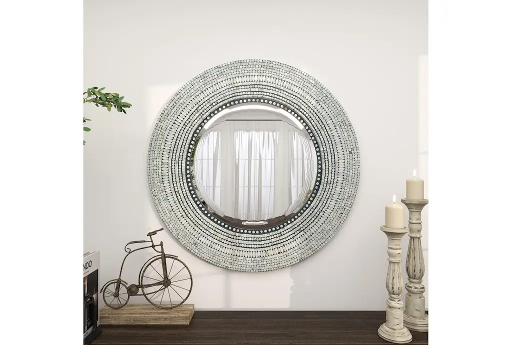 Add flair to your lobby, living room, or bedroom with this multicolor round wall mirror that reflects your style and helps bounce light around your space. This item ships in 1 carton. Due to the handmade nature of this item, no two will be alike, there will be slight differences in shape, size, and color. Can be hung vertically using the D-rings on the back; nails and screws not included. Suitable for indoor use only. This item ships fully assembled in one piece. Made in Vietnam. This is a single gray colored entryway mirror. Coastal style.
