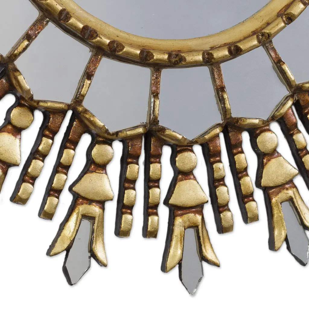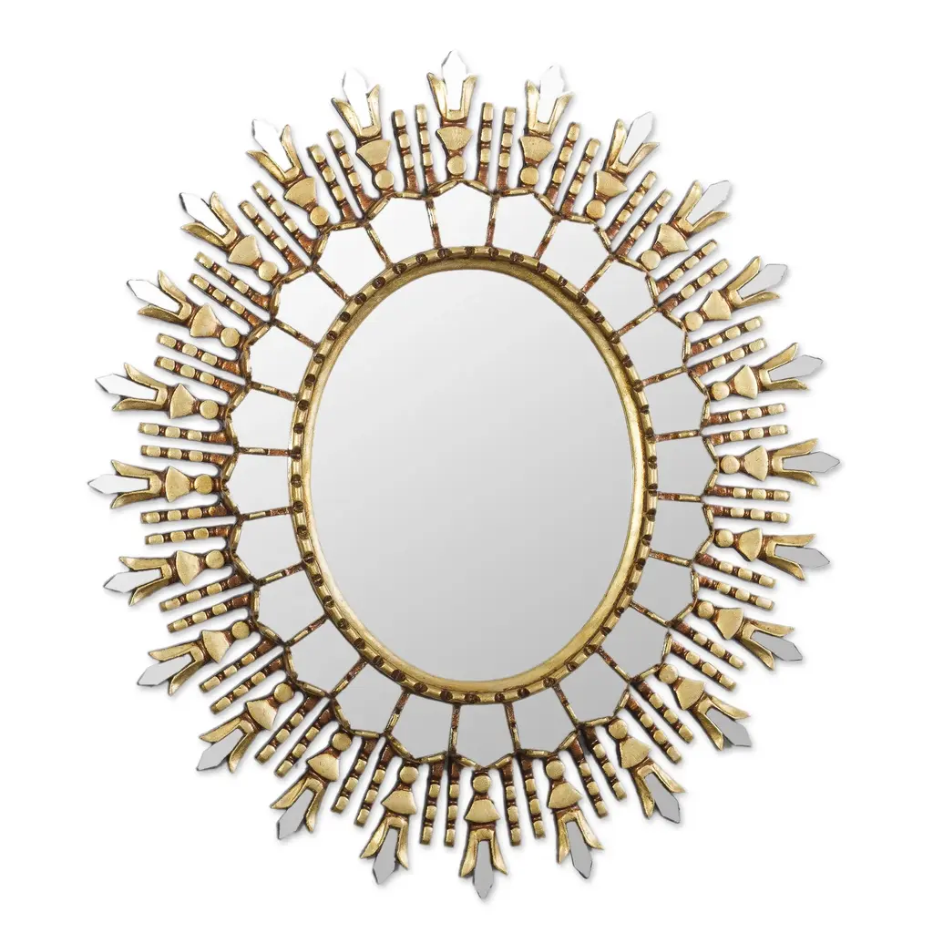 Blazing like the rays of the sun, accents of mohena wood and small mirrors frame this oval wall mirror from Peru. Gliseria Soto creates this mirror, which is crafted by hand in the style of colonial arts. Bronze leaf is applied over the wood for a gleaming gold-tone finish.
