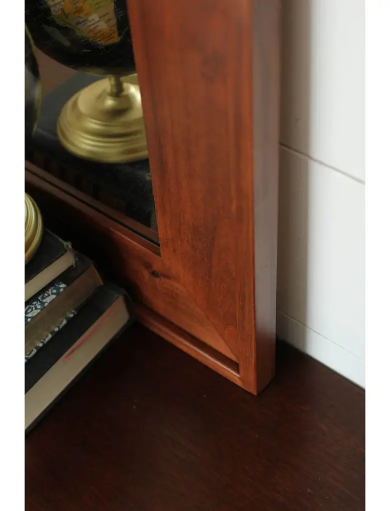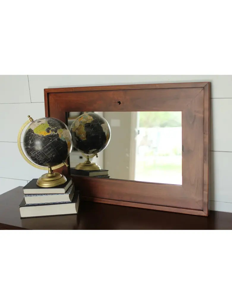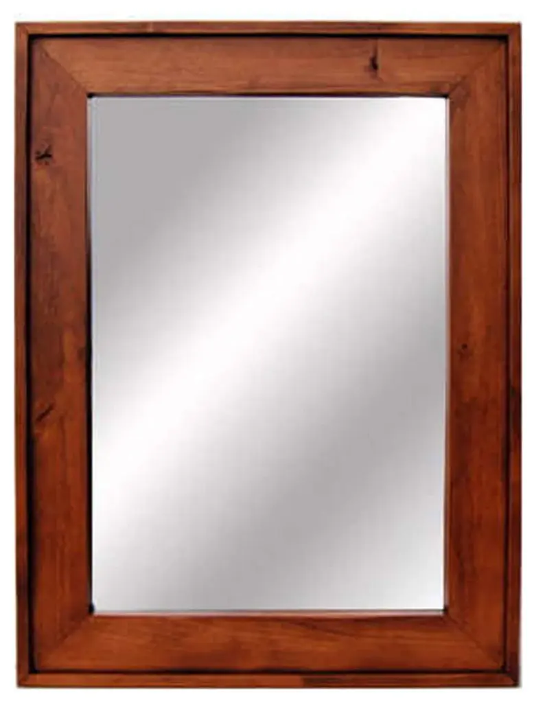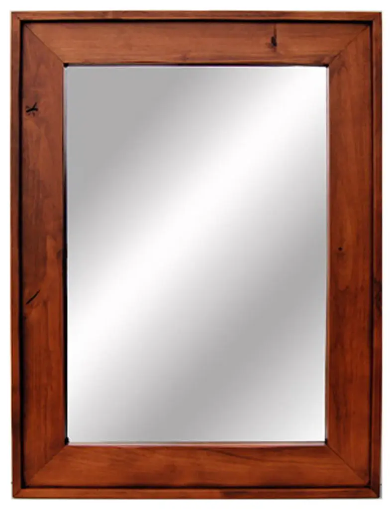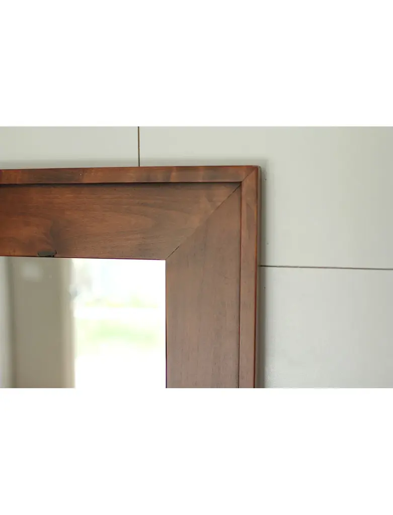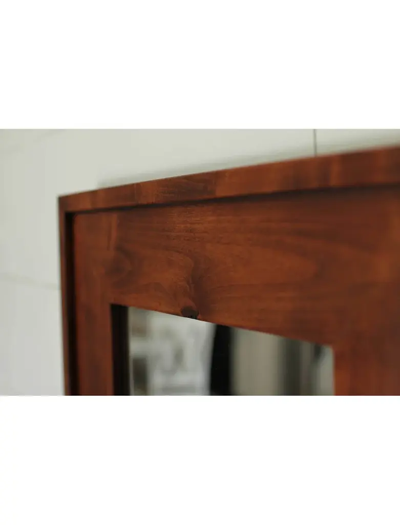 This beautiful hand-finished frame is built from solid alder and stained cherry. The frame is 4.25 inches wide with a depth of 1.25 inches. This beautiful wood mirror has been smoothed and polished making it versatile enough to look great in even more formal settings. Consider adding it above your bathroom vanity or by the front entry for quick touch-ups as you run out the door in the morning. The rich color of the finish makes it a great addition to a study with matching wood furniture..D-ring hanging hardware is included with each mirror allowing you to decide whether to hang it horizontally or vertically. Solid wood frame, 4.25 inches wide. Mirror sizes are listed according to exterior dimensions. Handcrafted in USA. PLEASE NOTE: Because of the possible variances in computer monitor colors and reclaimed wood colors, your completed frame may vary slightly in color and texture from the one you see pictured here.