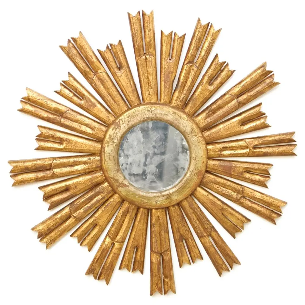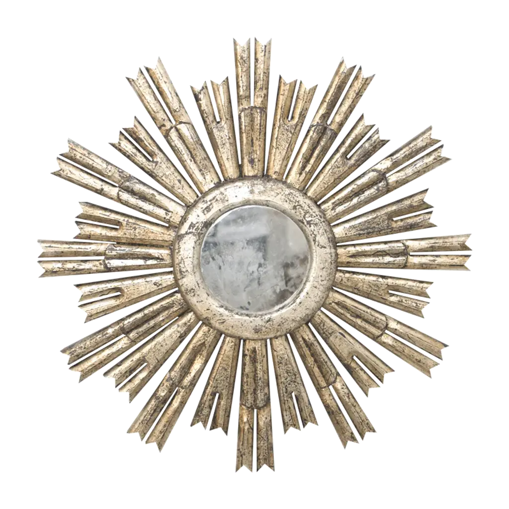 Inspired by the iconic emblem of the French sun king Louis XIV, the Rinaldo sunburst mirror by Worlds Away is at home in both classic and modern interiors. Handcarved with a hand finished gold or silver leaf finish and antique mirror inset.