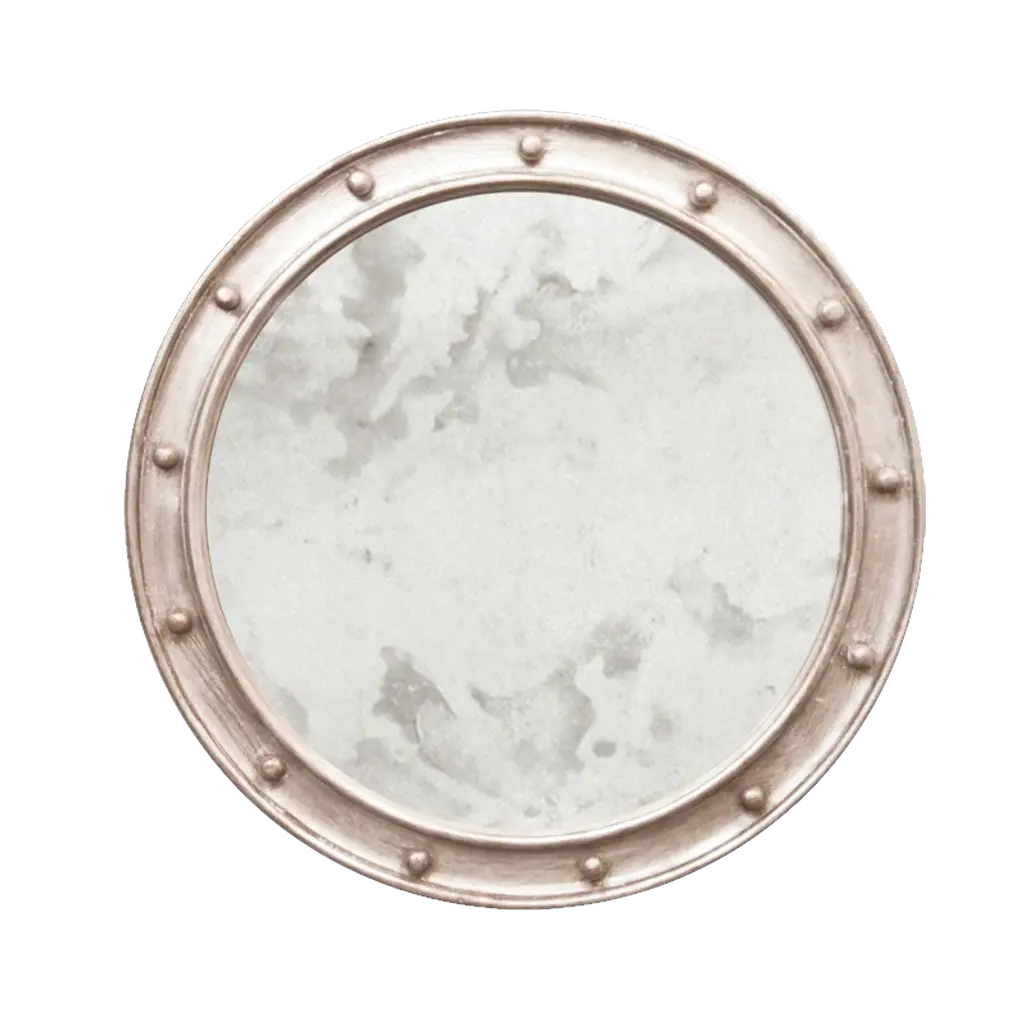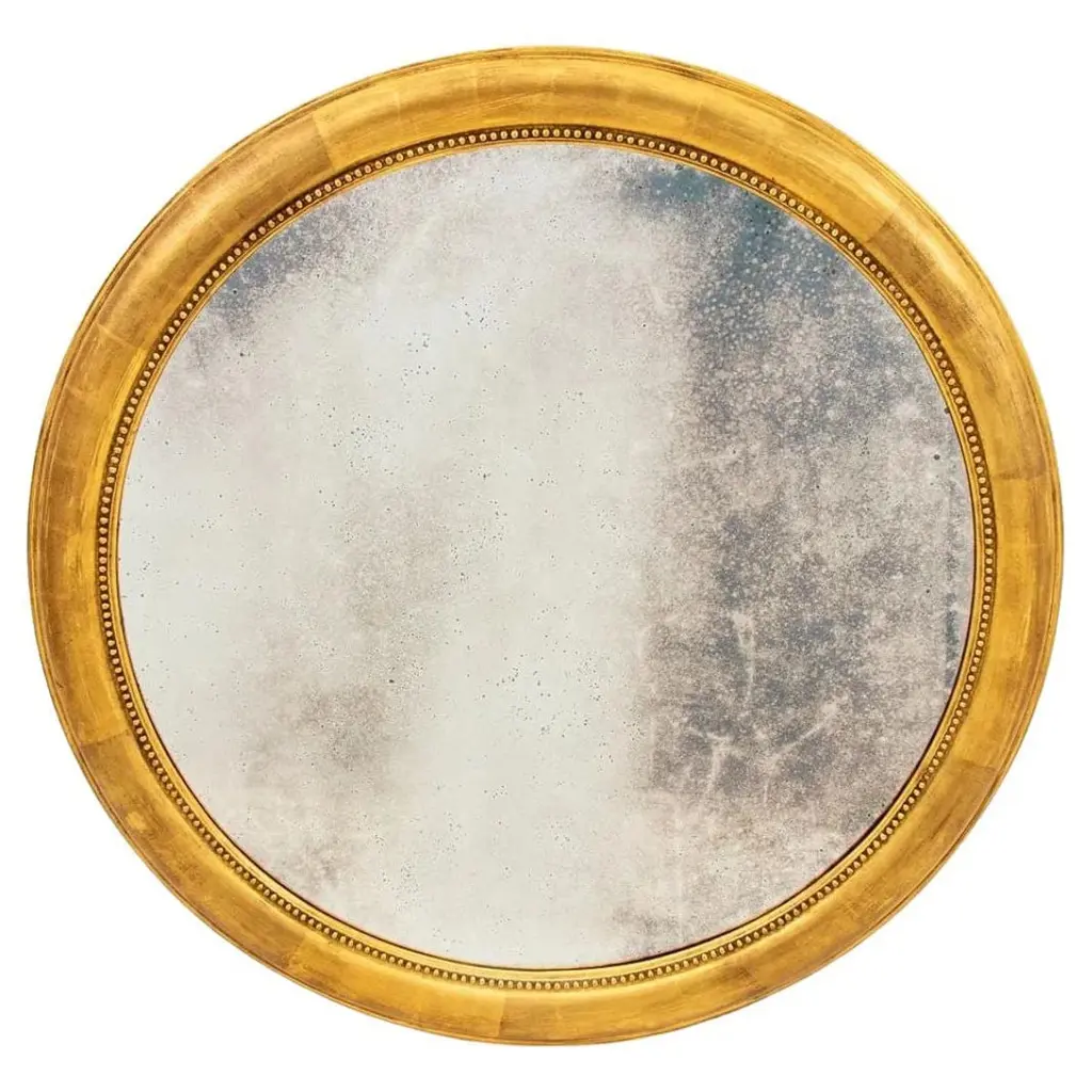From Worlds Away, this large round antique mirror is the essential accent for your entry hall or bathroom vanity. Its Federal style frame is hand finished in glimmering gold lead or champagne silver leaf.