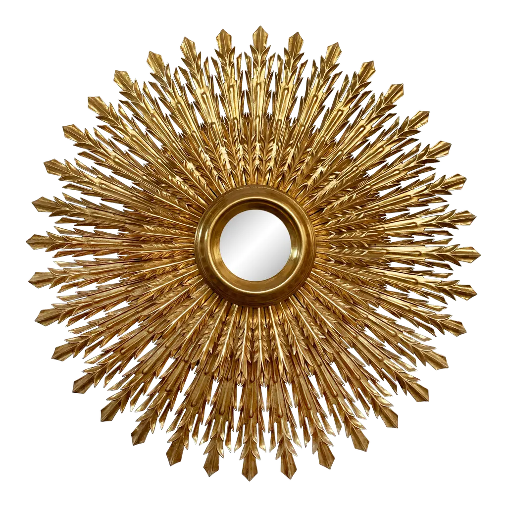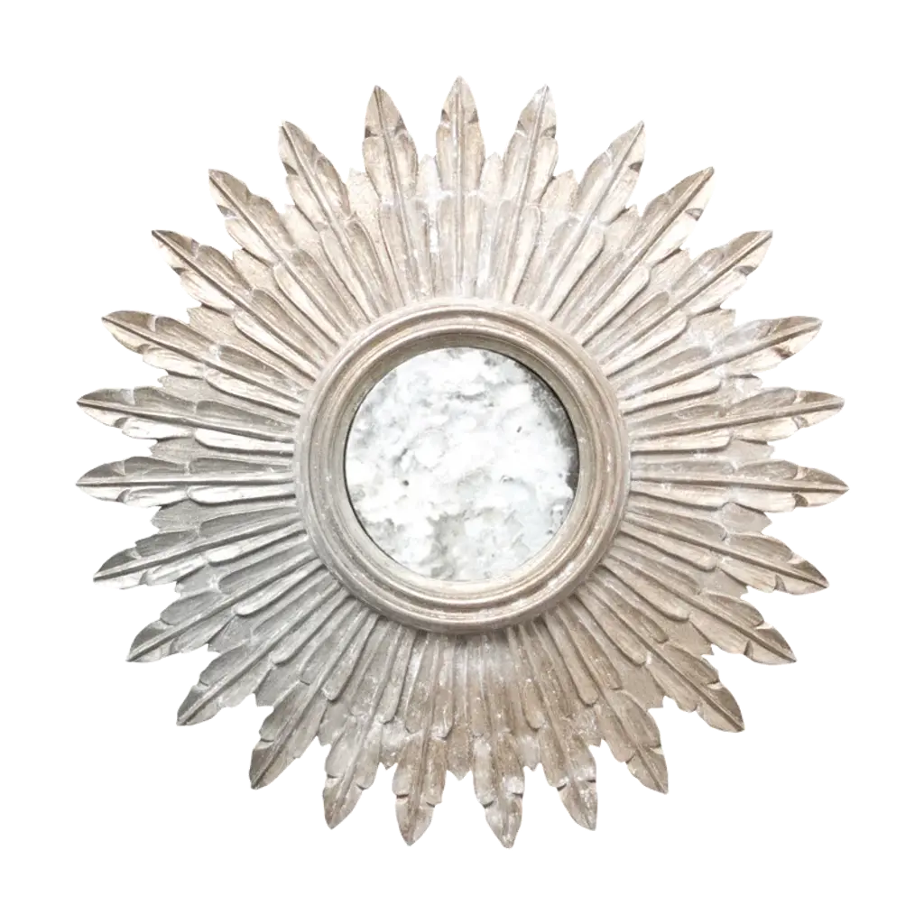 The delicate radial pluming of the hand-carved Santo mirror by Worlds Away is inspired by an archer's arrow.. Hand finished in exquisite champagne silver leaf or gold leaf with an antique mirror inset.