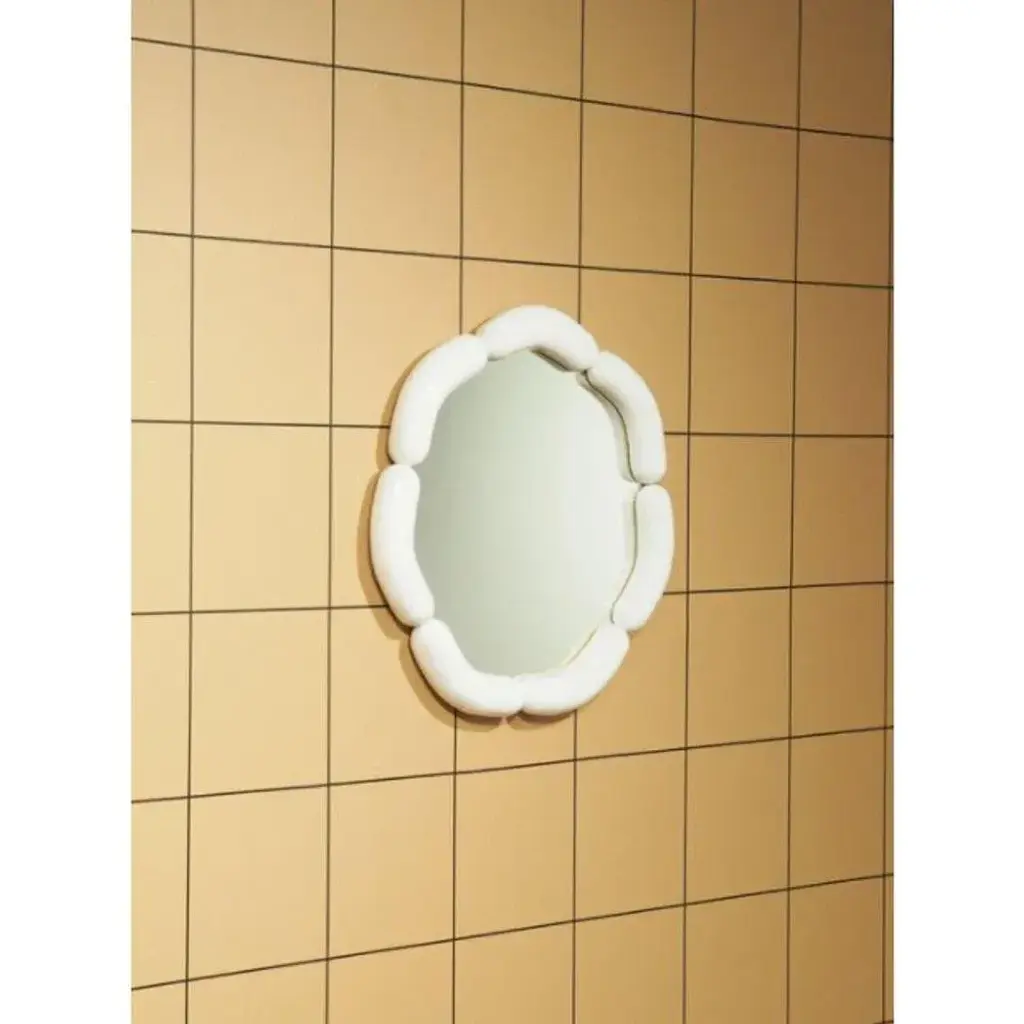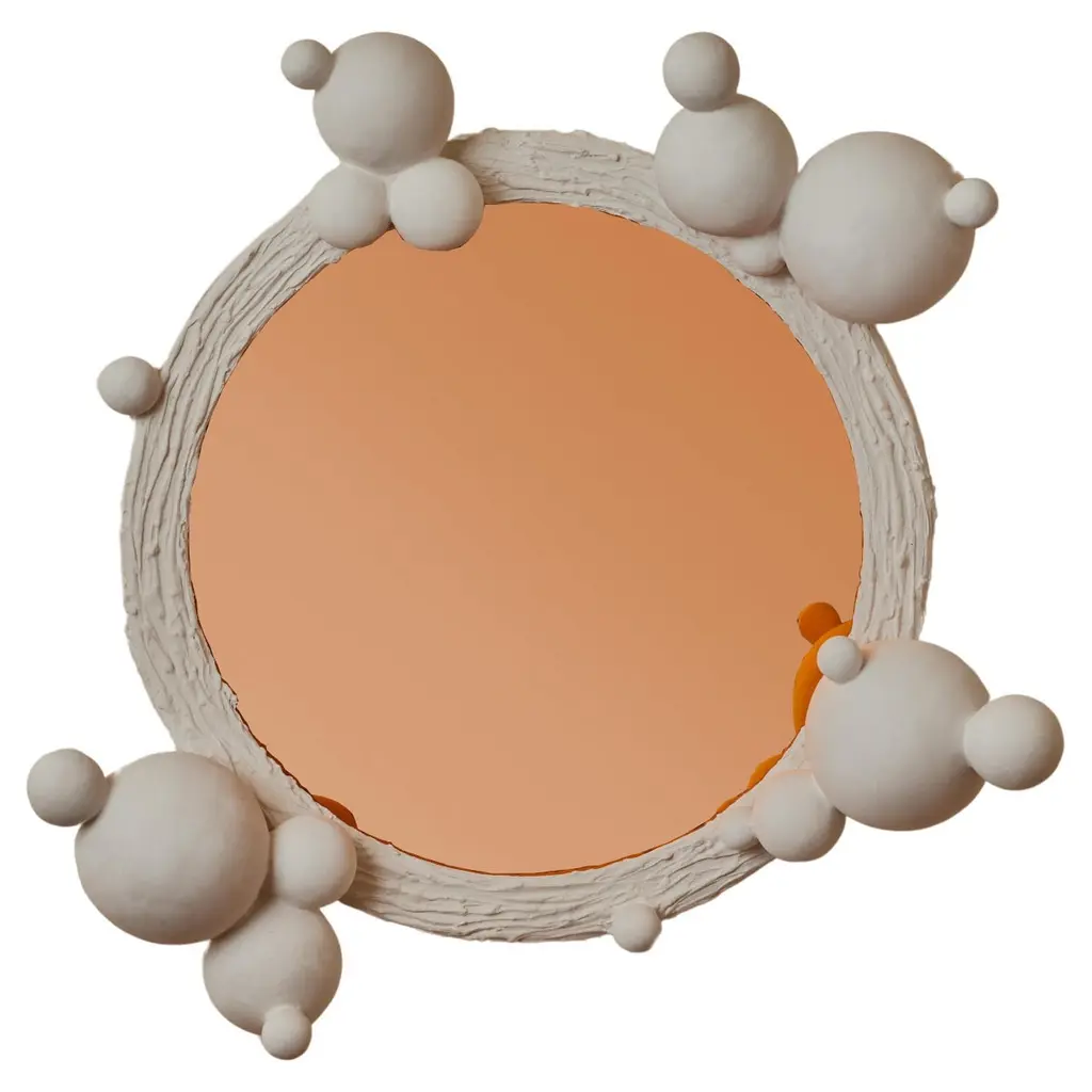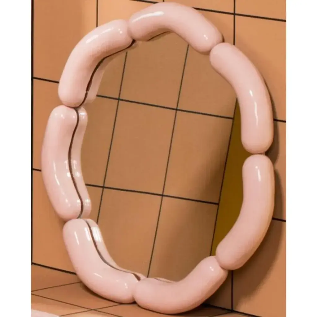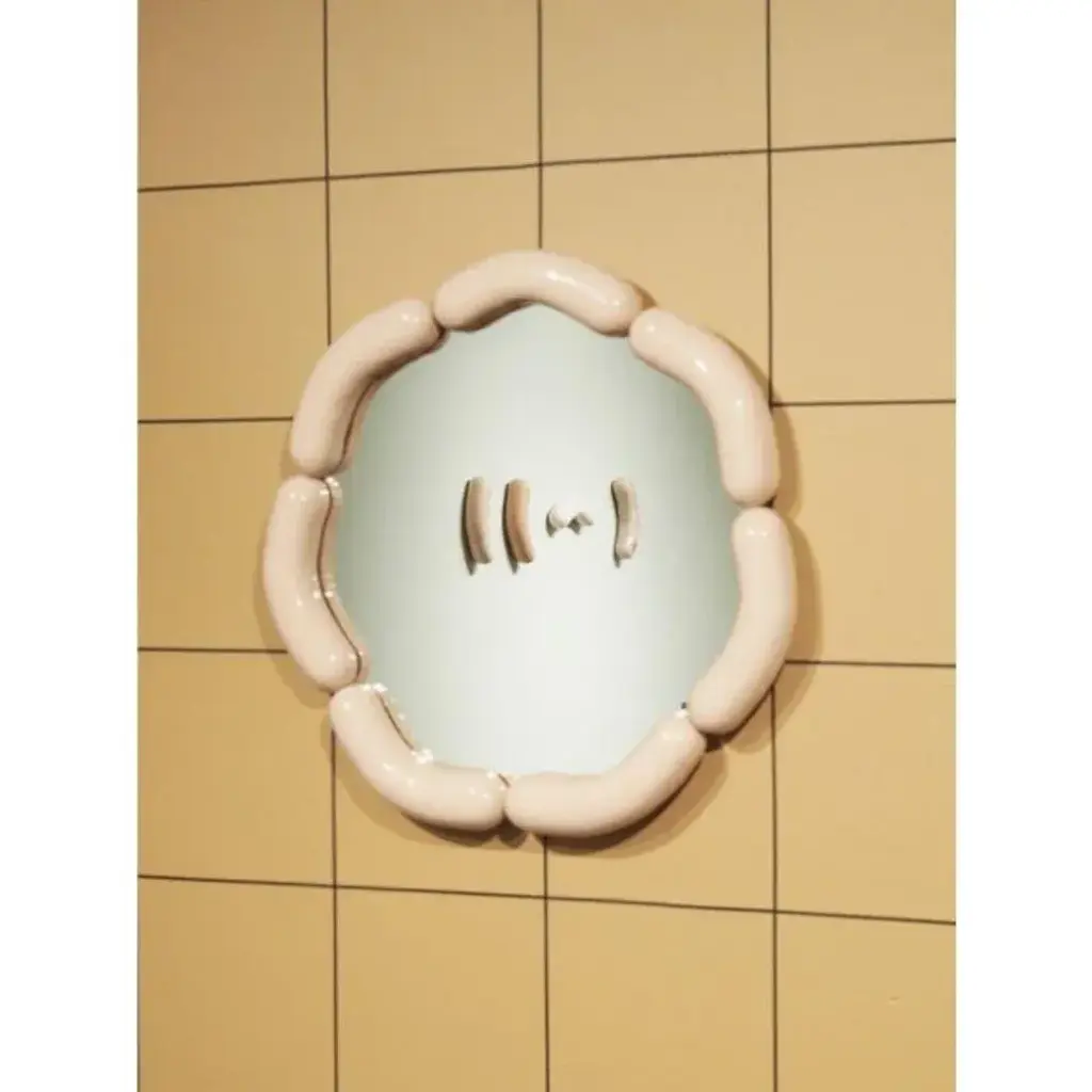 Set of 2 wurstie mirrors by tero kuitunen material: hand built ceramic, glass mirror, wood dimensions: d 49 x w 49 x h 5 cm numbered and signed. Ceramic wall mirror, numbered. Open edition. Designer tero kuitunen, b. 1986, is inspired by the interface of design and art, the unprejudiced apposition of things, floating sceneries, and the meaning of humor and touch in design. Alongside product design, tero is known for concept and space planning as well as memorable projects of contemporary art and design. He has graduated as a designer from the applied arts ma program at the aalto university school of art, design and architecture. Tero works as a product, concept and interior designer in projects for clients such as supercell, absolut vodka, hakola and many more. Currently tero is working as a freelance designer with a vast experience in the design and art field. He has participated in international exhibitions and fairs in e.g. Beirut, stockholm, japan and italy. 2019-2020 he curated and created the concept for wild at heart exhibition that toured to vienna, budapest, stockholm, tokyo and helsinki. In 2021 tero was invited to create together with karoliina hellberg and raimo saarinen a new exhibition at the prominent amos rex museum. Tero has received a one-year working grant from the finnish cultural foundation in 2017 and projects grands from arts promotion centre finland and city of kotka. Throughout his work, tero wants to find something that moves and touches people. Materials and colours are often his biggest inspiration when starting a new design project.