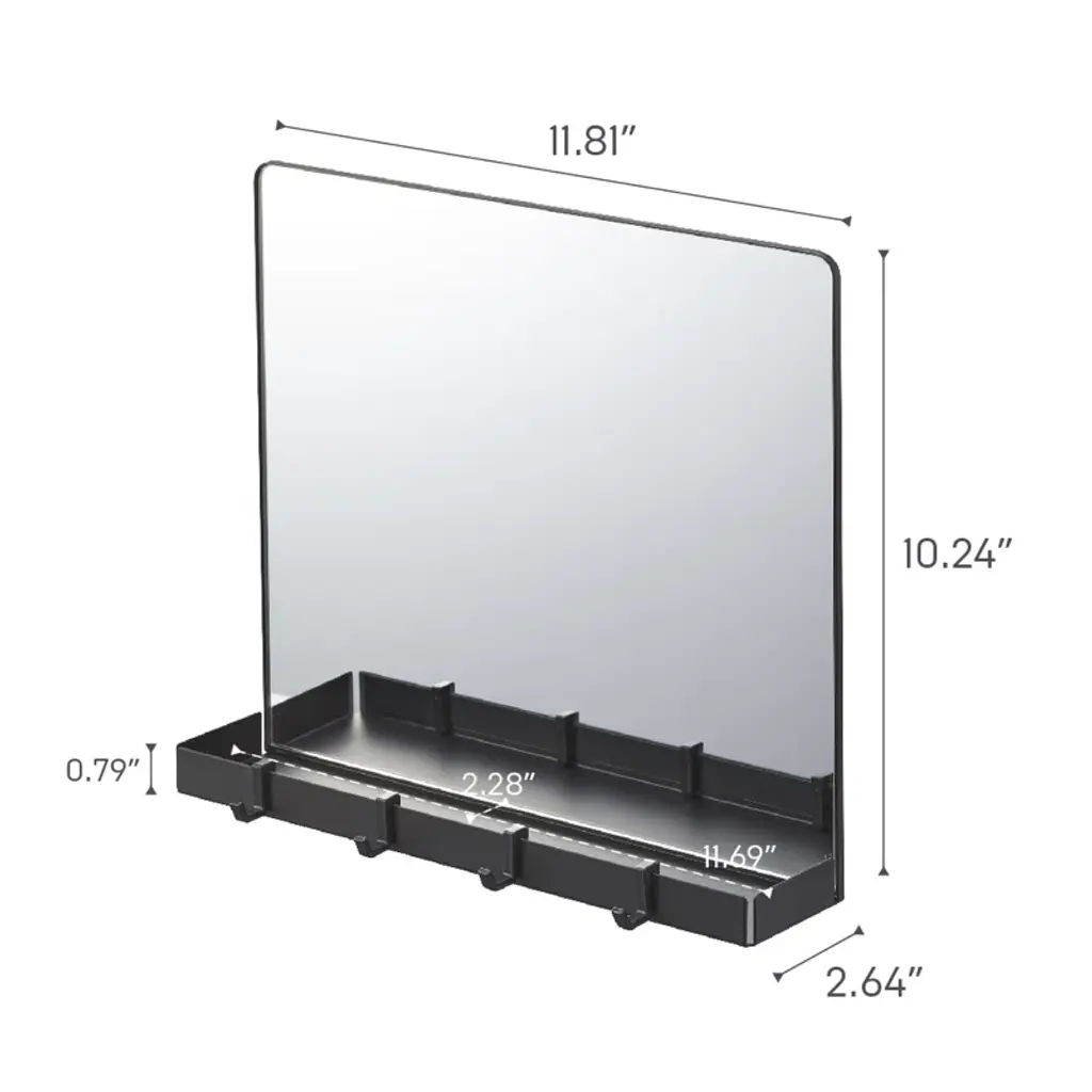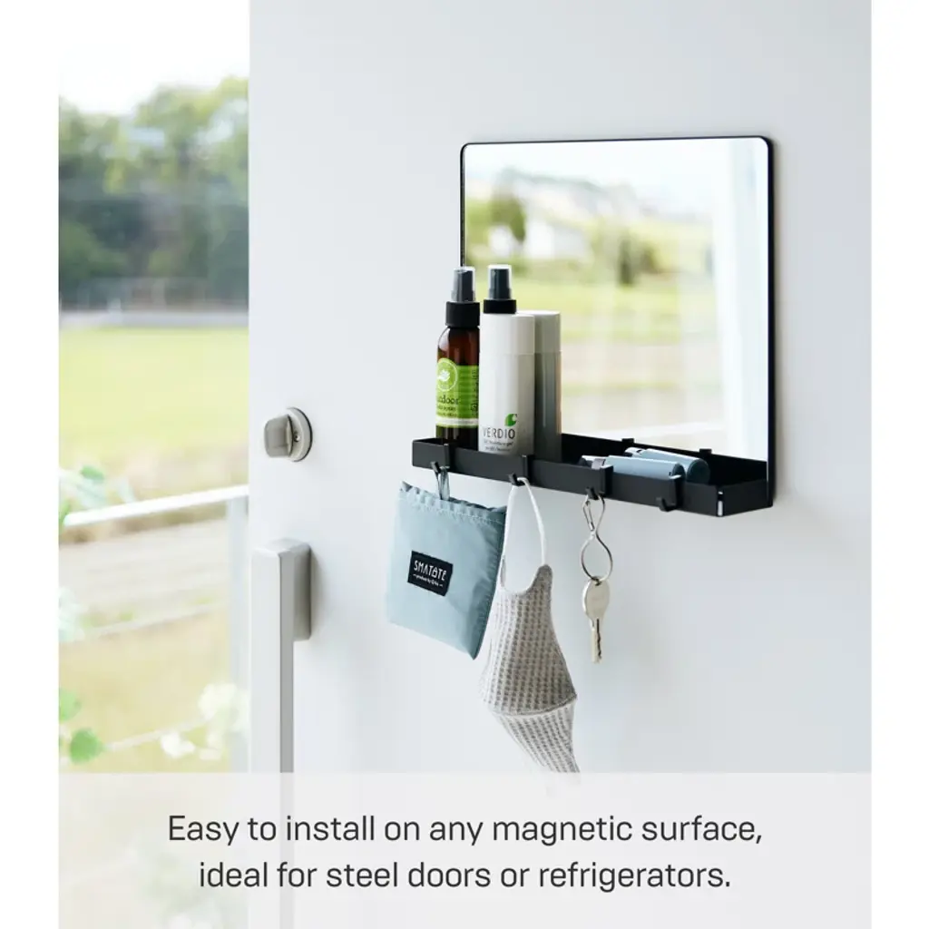 Check your look and grab essentials with the Magnetic Mirror with Storage Rack. Easily install on metal surfaces, featuring a shelf for small items and removable hooks for keys and bags. Perfect for entryway organization.