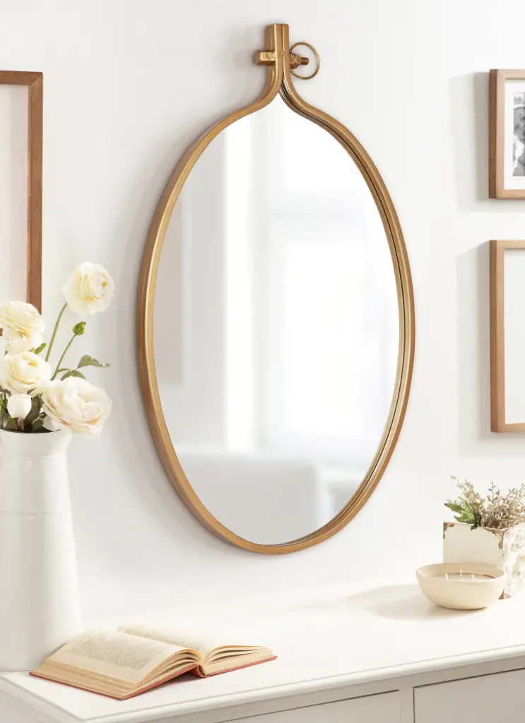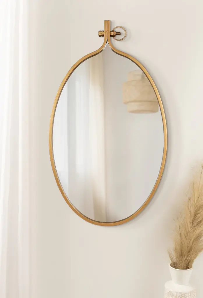Expand your space while capturing a timeless, industrial style with the Yitro mirror. This alluring wall mirror features an oval frame with craftsmanship reminiscent of vintage antiquity, forged from robust iron material. This textured iron frame''s dramatic presence is enhanced by its glamorous gold finish, creating a sense of refined elegance. The Yitro''s ample glass surface area is perfect for highlighting the depth of your space with an inner mirror that is 18.75 inches wide by 30 inches tall. This reflective surface is an excellent way to increase the vibrancy of your area while making the room feel more open. The outside dimensions of the Yitro are 20 inches wide by 1 inch deep by 34 inches tall, creating the ultimate focal point for your living room mantle, bedroom dresser, or entryway console. If you''re renovating your powder room with a modern, industrial style, this oval accent is also great as a bathroom mirror above your vanity. To mount this mirror without hassle, use the metal keyhole hanging bracket attached to the back of the frame for efficient installation.• ROBUST DESIGN: The Yitro mirror features an oval-shaped frame with an ornamental iron clasp serving as its crown, creating a careful blend of industrial and modern aesthetics• QUALITY MATERIALS: The Yitro wall mirror''s frame is made from rich iron material for a robust look and tough resiliency for years of display• AMPLE SIZE: The frame surrounding the large mirror is 18.75 inches wide by 30 inches tall, and the outer dimensions of the Yitro are 20 inches wide by 1 inch deep by 34 inches tall• VERSATILE: The Yitro oval is a fantastic decor element to introduce to your living room mantle, entryway console, or bedroom dresser. It''s also fantastic for introducing modern design to your bathroom as a vanity mirror• EASY TO HANG: To hang this beautiful accent mirror, use the robust metal keyhole hanger welded on the back for quick and easy wall-mounting in a matter of minutes