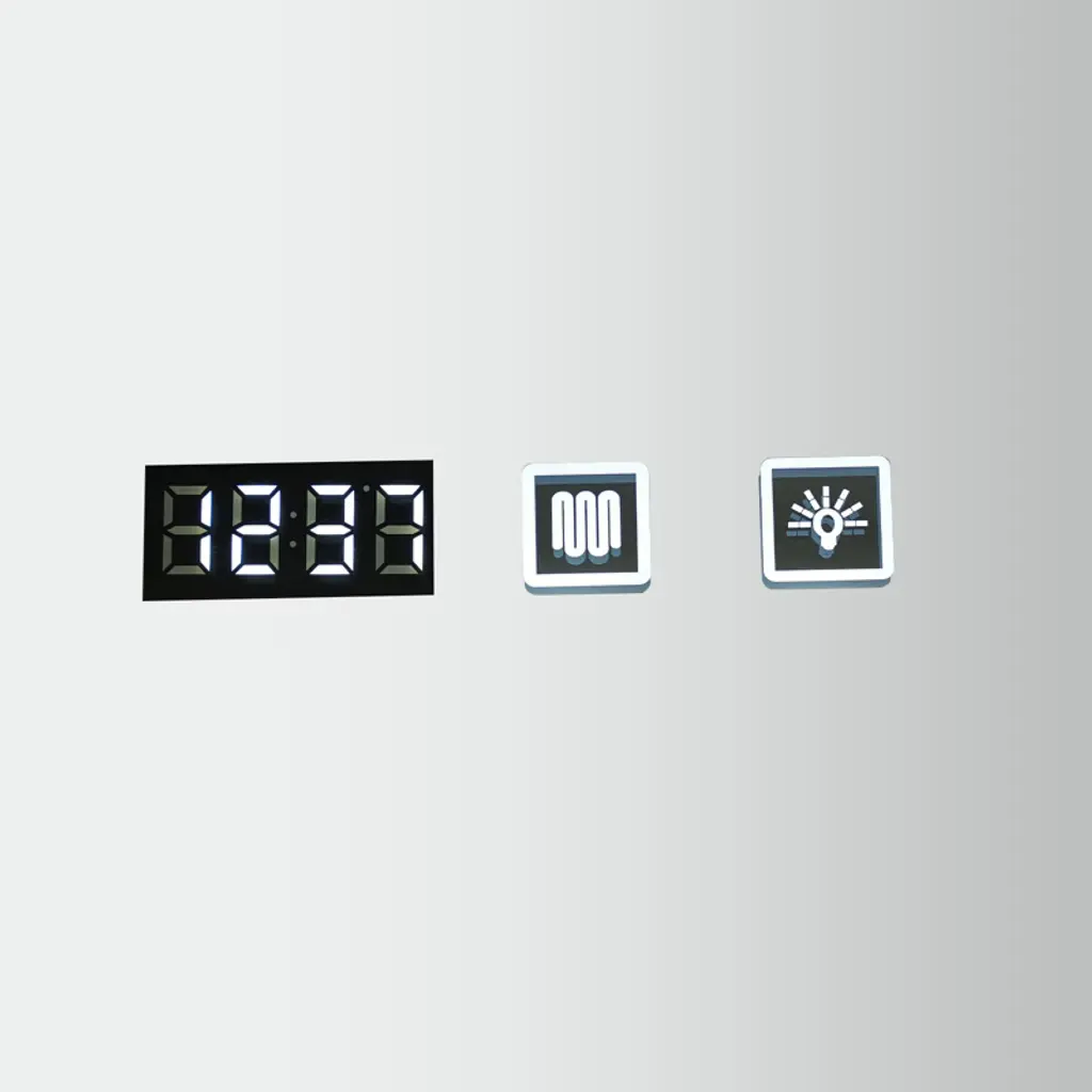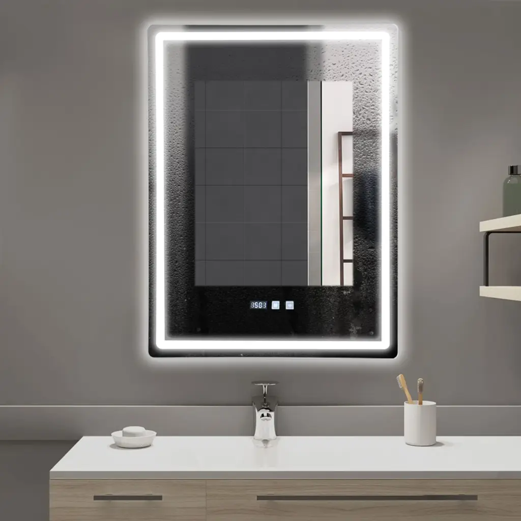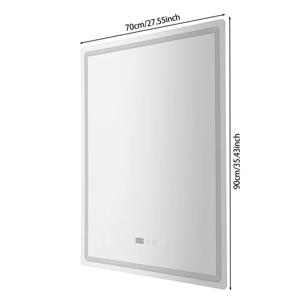 How to see clearly in a foggy mirror? Our LED dimmable bathroom mirror features a touch switch for easy operation. Built-in defogging function to keep the mirror clear. Real-time time display is convenient for schedule planning. Infinite dimming design to meet different lighting requirements. Come on and buy it and upgrade your bathroom experience. How to Install 1. Measure the distance between the two hooks on the back of the product. 2. Draw the balance line intersection on the wall according to the hook distance. 3. Punch holes in the wall and screw in the expansion screws (included). 4. Hang the product and complete the installation. Specification Material: PET, Glass Process: Double-Layer Spraying Paint Color: Silver Shape: Rectangular Style: Modern Installation Required: Yes Mounting Type: Wall Mount Power Source: Corded Plug Type: US Standard Light Source: LED Light Color: White Neutral Warm Input Voltage: AC110-240V 50/60Hz Output Voltage: DC12V 2A Power: 24W TA:40℃/104℉ TC:85℃/185℉ Brightness Range: 5-100% Color Temperature: 6000-4000-2700K Mirror Defogger Voltage: 110V Waterproof Rating: IP54 Heat Density: 2.5W/dm ² Temperature Value: 10-20℃/50-68℉ Defogging Area: 30*40cm/11.81*15.75in Product Size: 60*80cm/23.62*31.5in