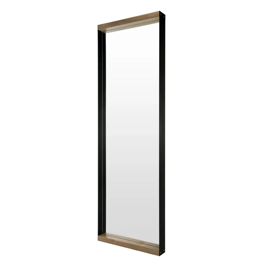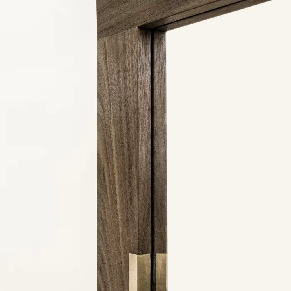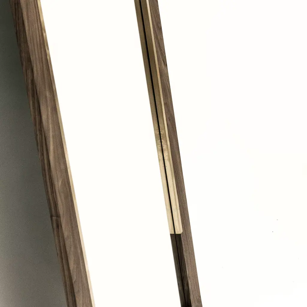 Perfect for the entryway, bedroom or living room, this refined mirror has a clear and pure frame handcrafted of solid walnut wood embellished with two brass inserts that follow the side on the inside frame. The warm texture of the wood combines gracefully with the golden tones of the brass, to create a modern piece that is sure to make a stylish statement in any decor.
