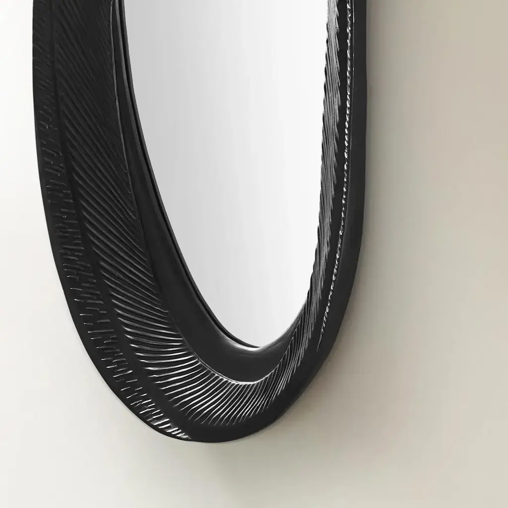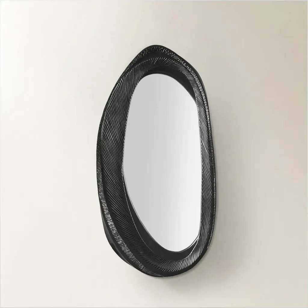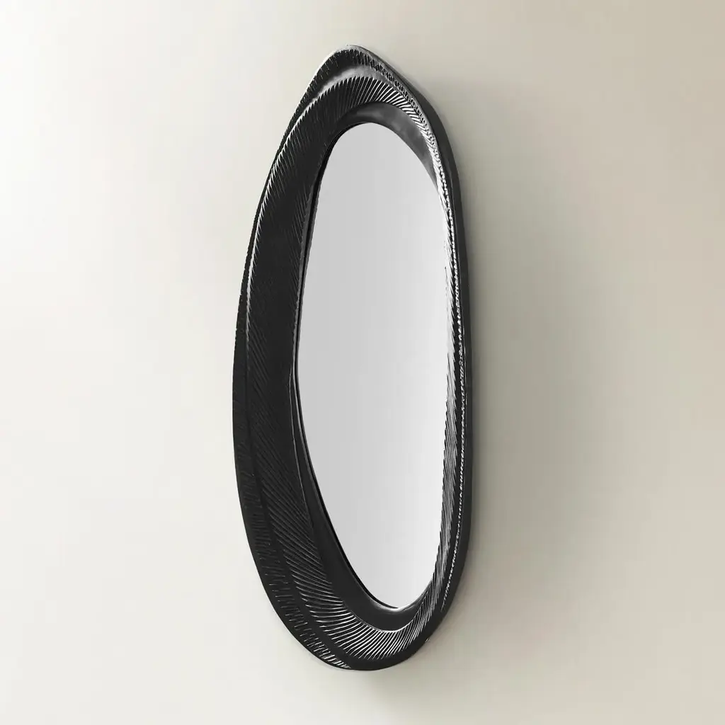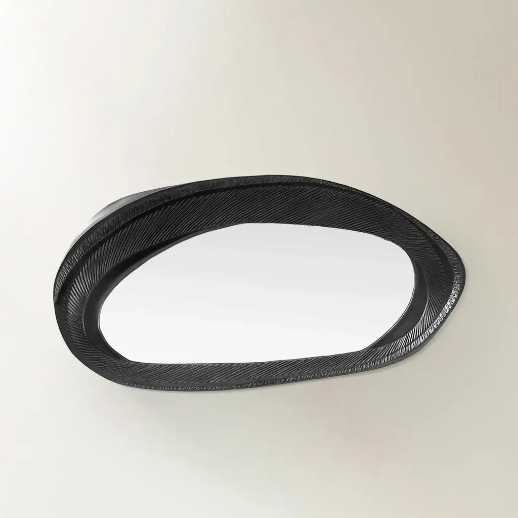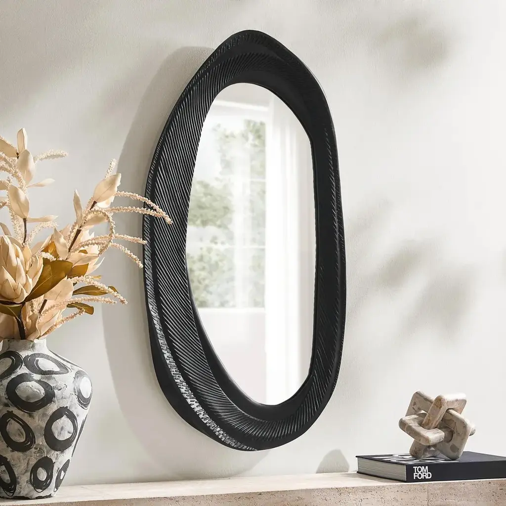 The Zuma Wall Mirror adds bold dimension to any space with its sculptural resin frame and rippled texture. Its fluid oval shape and deep black finish evoke effortless modern elegance, while the mirror’s reflective clarity enhances light and scale. Designed to hang vertically or horizontally, Zuma brings a dynamic presence to entryways, bedrooms, or living areas—perfect for layering depth and artistic edge into your decor.