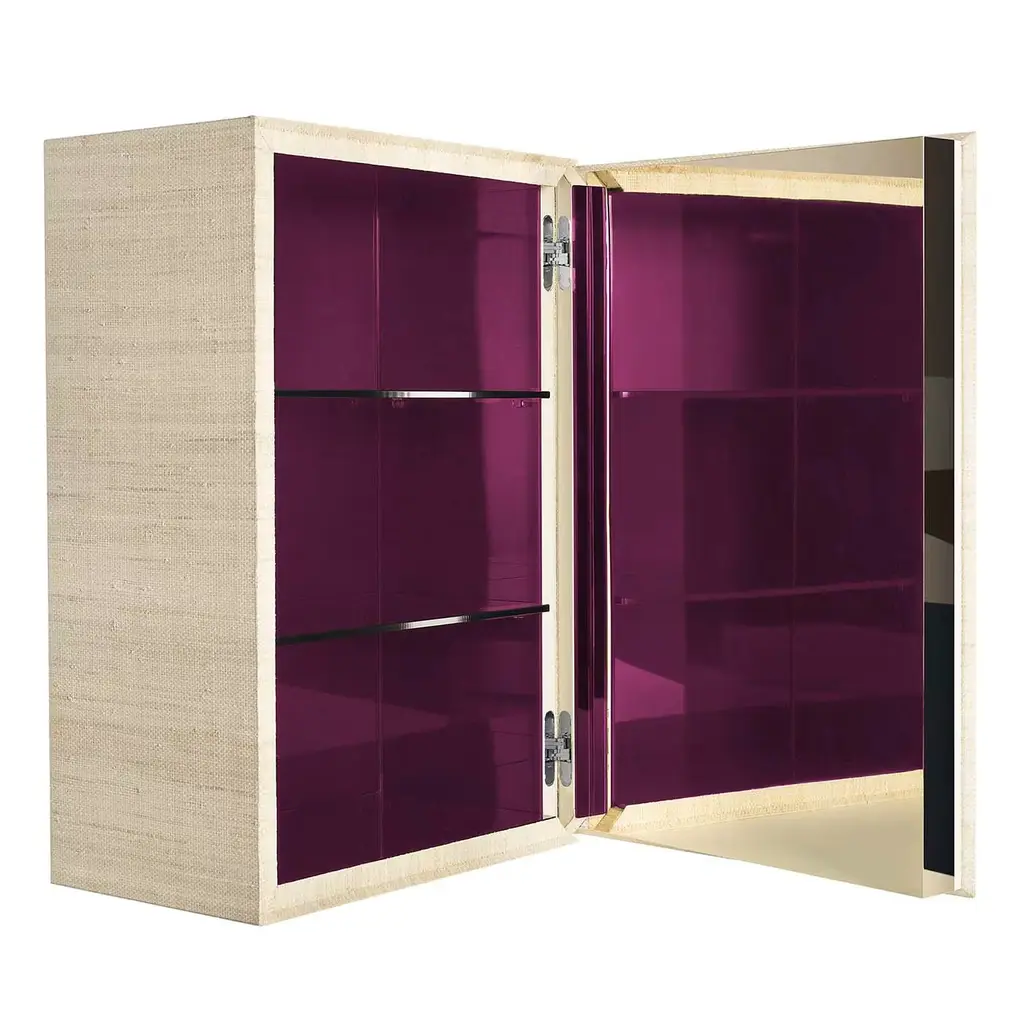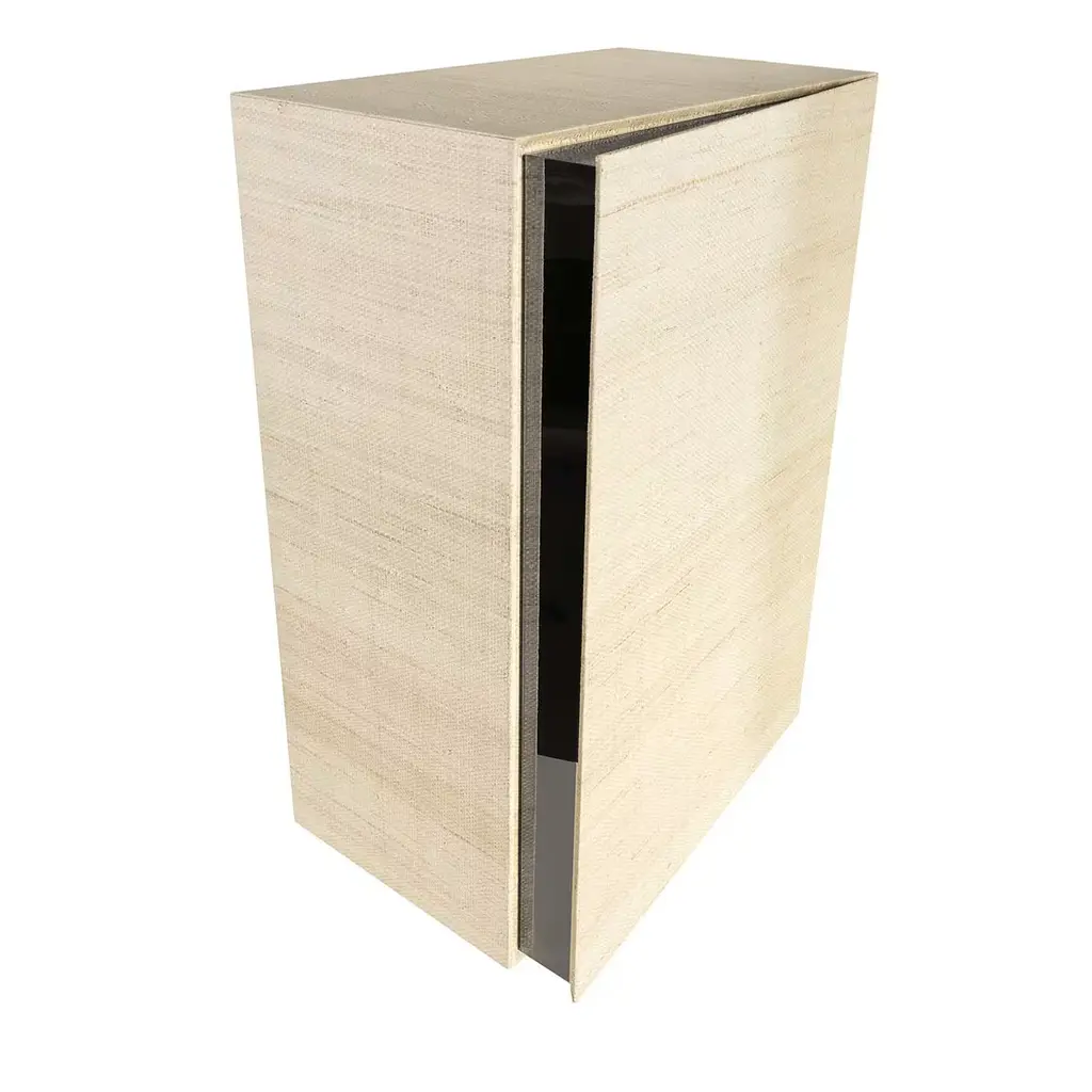 This functional piece of decor, designed by Italian architect Davide Rizzo in collaboration with AVD, is certain to make a statement in any room with its combination of luxury materials and sleek aesthetic. Featuring a large-sized compartment lined with blue mirrors and two shelves, the rectangular frame of natural raffia has a single door accented with a triangular insert of black nickel-finished metal around the frame that creates the effect of a slightly opened door. Brimming with chic appeal, this piece is the perfect accent for adding effortlessly trendy style and a curated touch to any home.