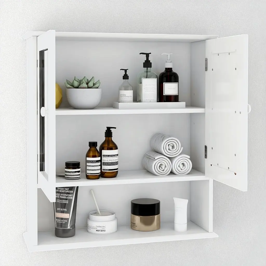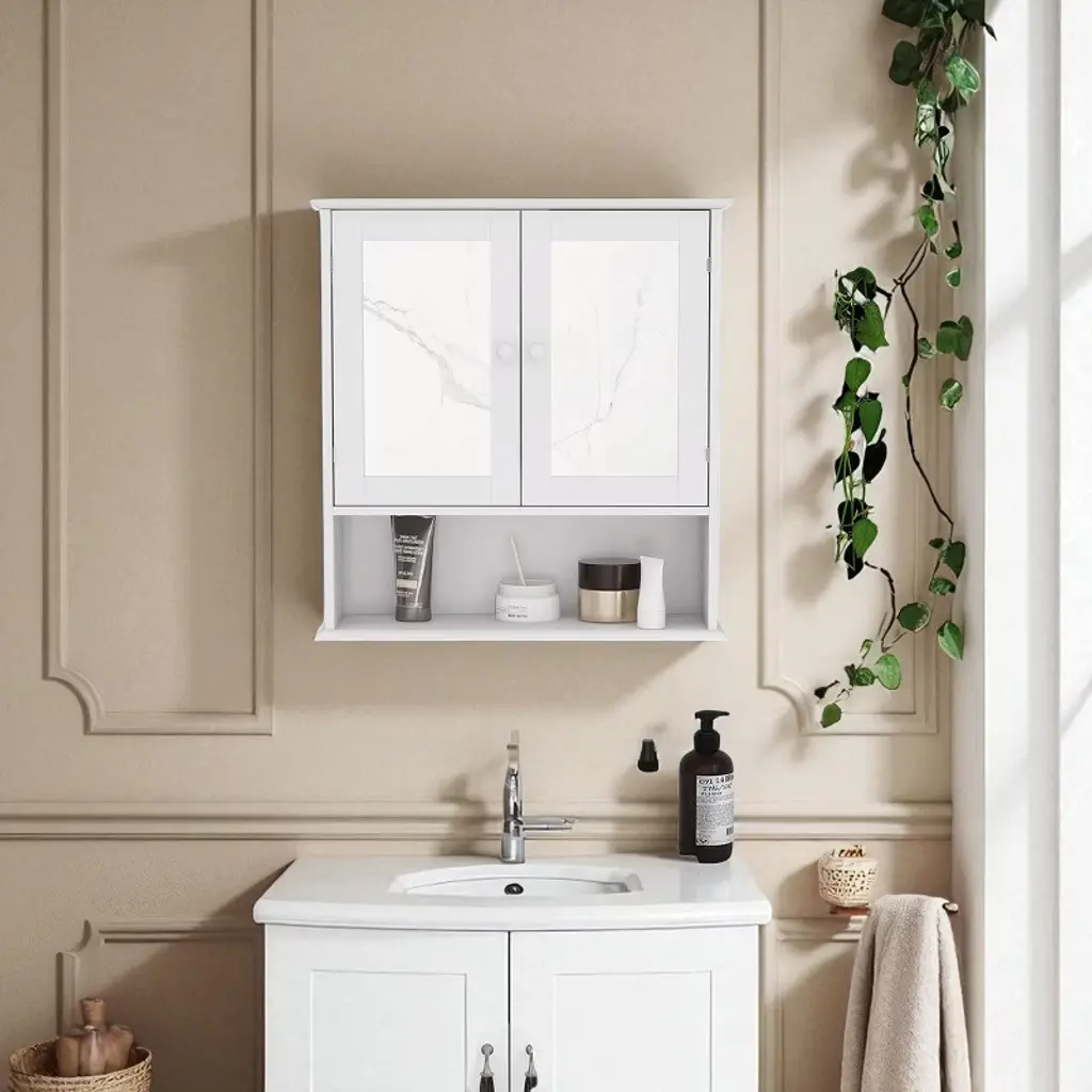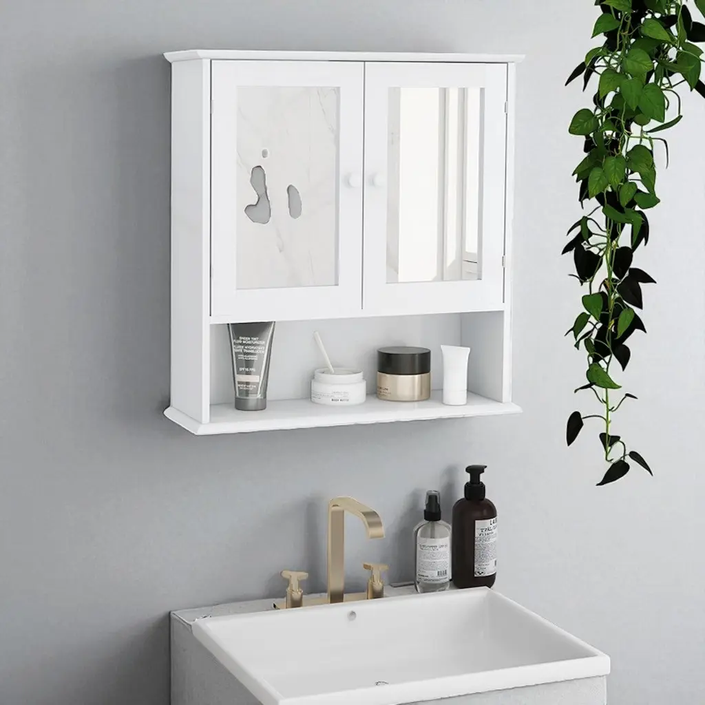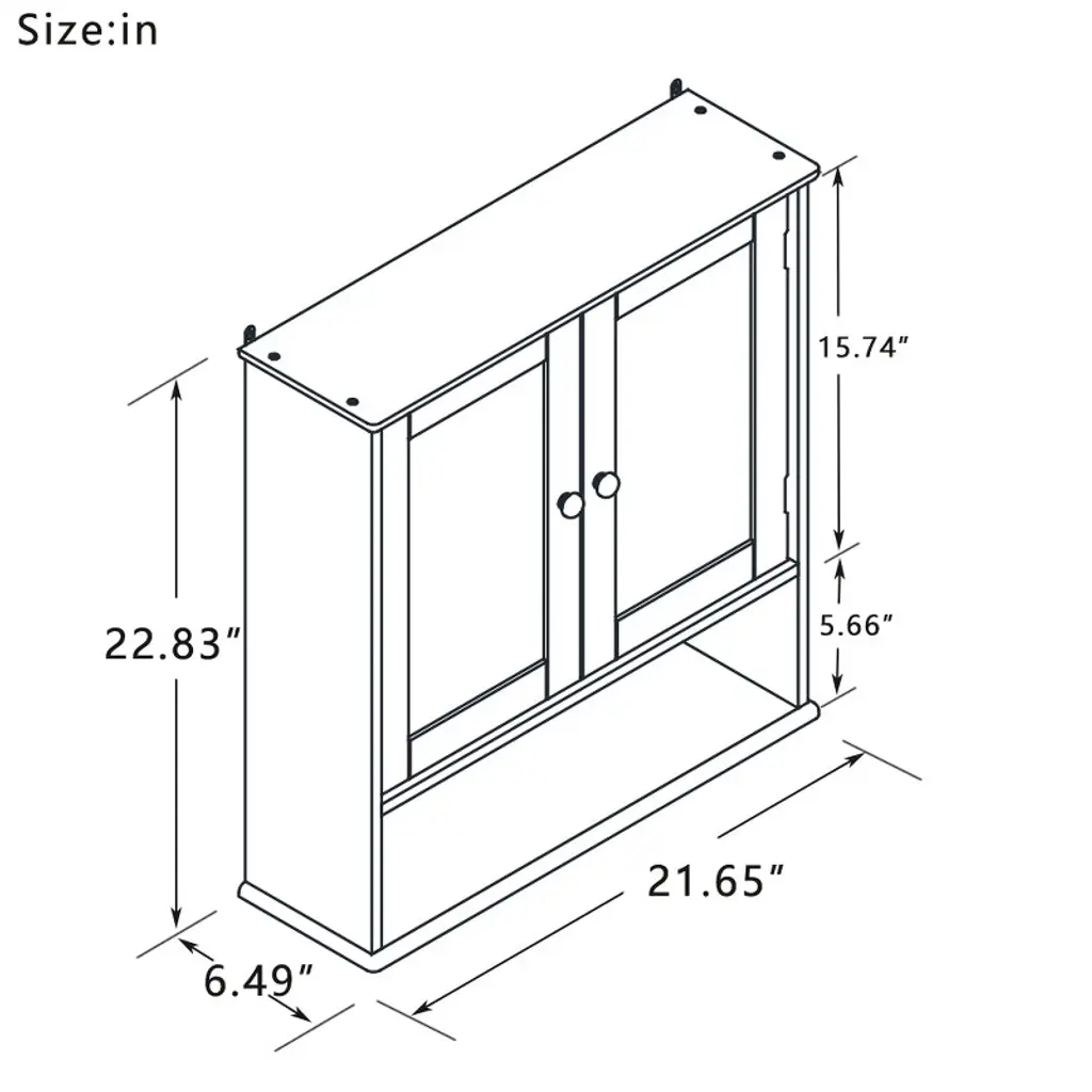 Product Overview Maximize your bathroom storage while adding a touch of elegance with this 21.6" wall cabinet. Featuring double mirrored doors and an open shelf, it combines practicality with modern style, keeping your essentials organized and within reach. Specifications Product Type: Cabinet Main Material: MDF Finish: UV Painting Product Dimensions Assembled Length (in.): 21.65 Assembled Width (in.): 6.49 Assembled Height (in.): 22.83 Product Weight (lbs.): 14.42 Product Features Multipurpose Storage: Enclosed cabinet with double shutter-style mirrored doors plus an open shelf for towels, toiletries, and decor. Space-Saving Design: Wall-mounted structure provides extra storage without occupying floor space, perfect for small bathrooms. Adjustable Shelf: Includes 1 tier of adjustable shelving with 3 height options, allowing you to organize items of different sizes. Simple & Stylish Look: White UV-painted finish and mirrored doors create a modern, fresh aesthetic while enhancing brightness. Easy Assembly: Comes with all required parts and a clear illustrated manual for quick and hassle-free installation. Suitable Scenarios Ideal for bathrooms, powder rooms, or laundry spaces. Perfect for storing daily essentials like soaps, skincare, medicines, or decorative accents while keeping clutter hidden. Notes 1. Real Product's Color may be slightly different due to lighting or monitor display. 2. Manual measurement has been used, there may be some reasonable error. 3. Avoid over-tightening screws to prevent surface damage.