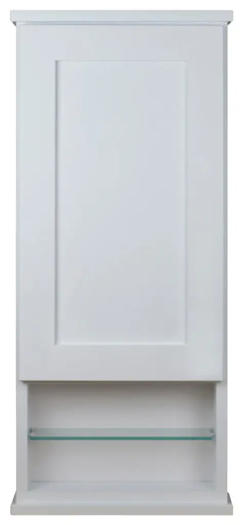 Mounts on the wall with steel mounting brackets inside for an easy installation. With two mounting methods, there is no need to worry about where the studs are in the wall. Three fully adjustable glass shelves slide into our patented shelf supports so they don''t tip or rock. Shaker style panel door sits on concealed hinges with soft close feature, door is reversible so you can mount it to open either direction. Cabinet portion is 16.5" high INSIDE, open shelf is 5.25" high INSIDE. Perfect as a medicine cabinet, spice cabinet, or storage cabinet anywhere. OVERALL Measurements are 25.5h x 15.25w x 6.25"d OVERALL. You''ll have nearly 5.5" of depth INSIDE the cabinet. White enamel finish. Solid pine cabinet box with solid maple door. Proudly made in the USA.
