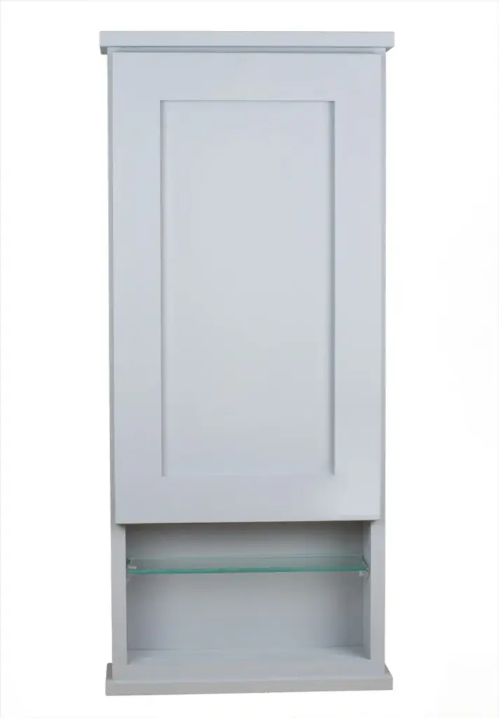 Mounts on the wall with steel mounting brackets inside for an easy installation. With two mounting methods, there is no need to worry about where the studs are in the wall. Four fully adjustable glass shelves slide into our patented shelf supports so they don''t tip or rock. Shaker style panel door sits on concealed hinges with soft close feature, door is reversible so you can mount it to open either direction. Cabinet portion is 16.5" high INSIDE, open shelf is 11.25" high INSIDE. Perfect as a medicine cabinet, spice cabinet, or storage cabinet anywhere. OVERALL Measurements are 31.5h x 15.25w x 8"d OVERALL. You''ll have nearly 7.25" of depth INSIDE the cabinet. Primed and ready for you to paint it. Solid pine cabinet box with solid maple door. Proudly made in the USA.