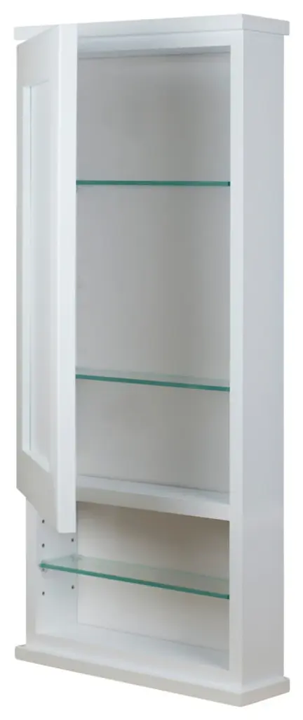 Mounts on the wall with steel mounting brackets inside for an easy installation. With two mounting methods, there is no need to worry about where the studs are in the wall. Four fully adjustable glass shelves slide into our patented shelf supports so they don''t tip or rock. Shaker style panel door sits on concealed hinges with soft close feature, door is reversible so you can mount it to open either direction. Cabinet portion is 22.5" high INSIDE, open shelf is 5.25" high INSIDE. Perfect as a medicine cabinet, spice cabinet, or storage cabinet anywhere. OVERALL Measurements are 31.5h x 15.25w x 3.25"d OVERALL. You''ll have nearly 2.5" of depth INSIDE the cabinet. White enamel finish. Solid pine cabinet box with solid maple door. Proudly made in the USA.