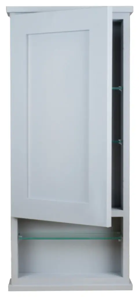 Mounts on the wall with steel mounting brackets inside for an easy installation. With two mounting methods, there is no need to worry about where the studs are in the wall. Four fully adjustable glass shelves slide into our patented shelf supports so they don''t tip or rock. Shaker style panel door sits on concealed hinges with soft close feature, door is reversible so you can mount it to open either direction. Cabinet portion is 22.5" high INSIDE, open shelf is 5.25" high INSIDE. Perfect as a medicine cabinet, spice cabinet, or storage cabinet anywhere. OVERALL Measurements are 31.5h x 15.25w x 5.25"d OVERALL. You''ll have nearly 4.5" of depth INSIDE the cabinet. Primed and ready for you to paint it. Solid pine cabinet box with solid maple door. Proudly made in the USA.