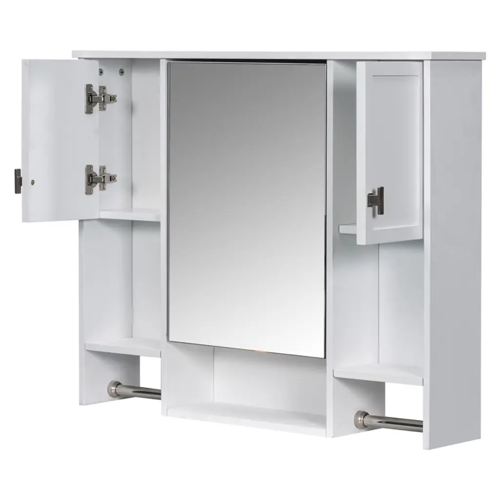 35'' x 28'' Modern Wall Mounted Bathroom Storage Cabinet This wall-mounted mirror cabinet perfectly combines modern design with excellent functionality. It is made of high-quality MDF board, which is durable and environmentally friendly. The high-definition mirror provides clear reflections, making every use convenient and quick. The clever design combines hidden and open shelves to store personal items and keep the space tidy, while displaying commonly used items for easy access. Two built-in storage cabinets meet large-capacity storage needs and perfectly hide clutter. The three-layer adjustable storage board allows you to flexibly adjust the storage space according to your needs and adapt to the storage of different items. The included towel rod design allows you to easily hang towels or clothes, increasing the practicality and convenience of the bathroom. Whether it is the bathroom, bedroom or other space, this mirror cabinet can provide a neat, practical and beautiful storage solution to improve the quality of your home life. Exquisite and Durable Hardware Combining high-quality materials and exquisite craftsmanship, it ensures long-lasting use and excellent performance. Whether it is door handles, hinges or drawer slides, they can show modern beauty and practicality. Modern Minimalist Style The simple lines and elegant appearance make this mirror cabinet perfectly integrated into various home styles, from modern, Nordic to minimalist styles, which can be easily matched to enhance your home taste. Both Hidden and Open Shelves The cleverly designed storage space has both closed shelves to help hide and store personal items and keep them tidy, and open shelves to provide convenient and quick access space for commonly used items, which is both practical and beautiful. About This Item Functional Keywords 1.Versatile Storage Solution 2.Ample Storage Space 3.Premium Door Hinge 4.High-Quality MDF Board 6.Adjustable Soft-Close Hinges Appearance Keywords 1.Modern Style 2.Vintage Handle