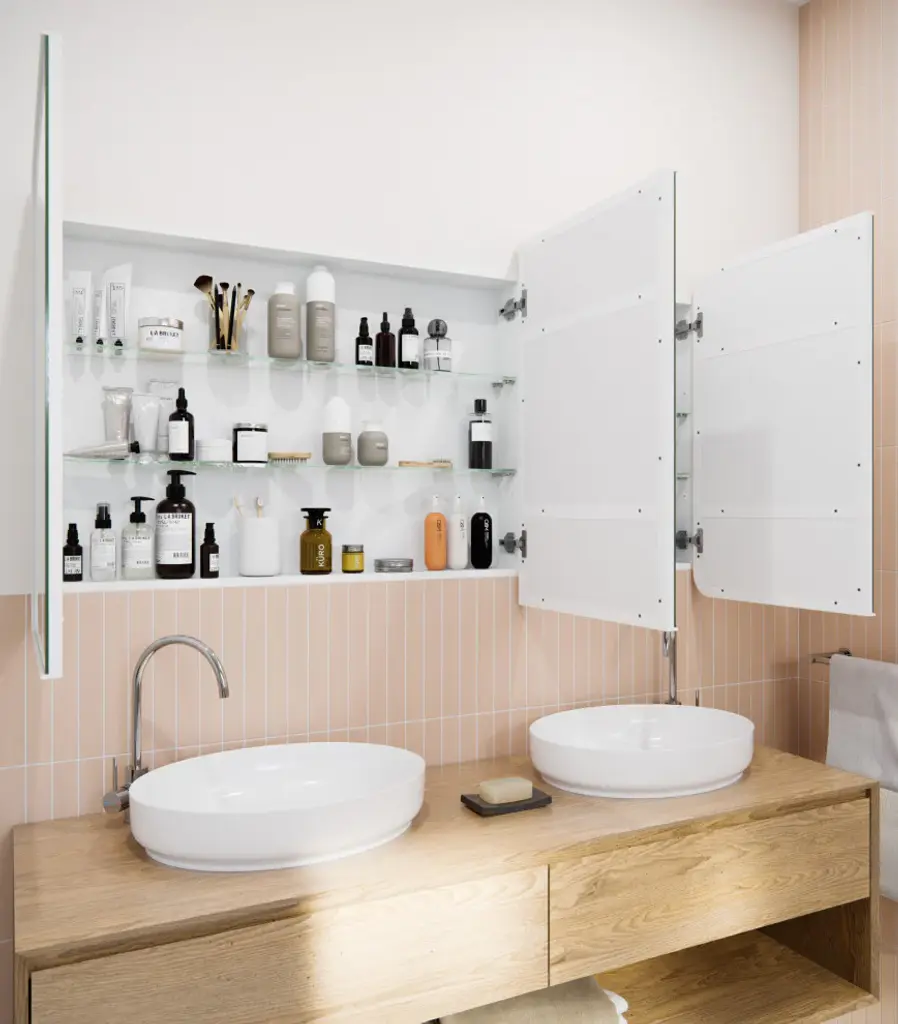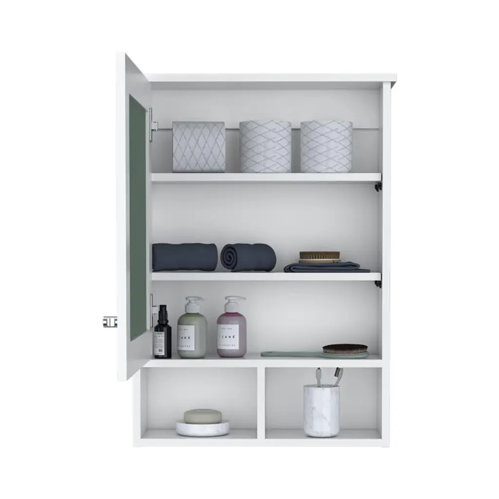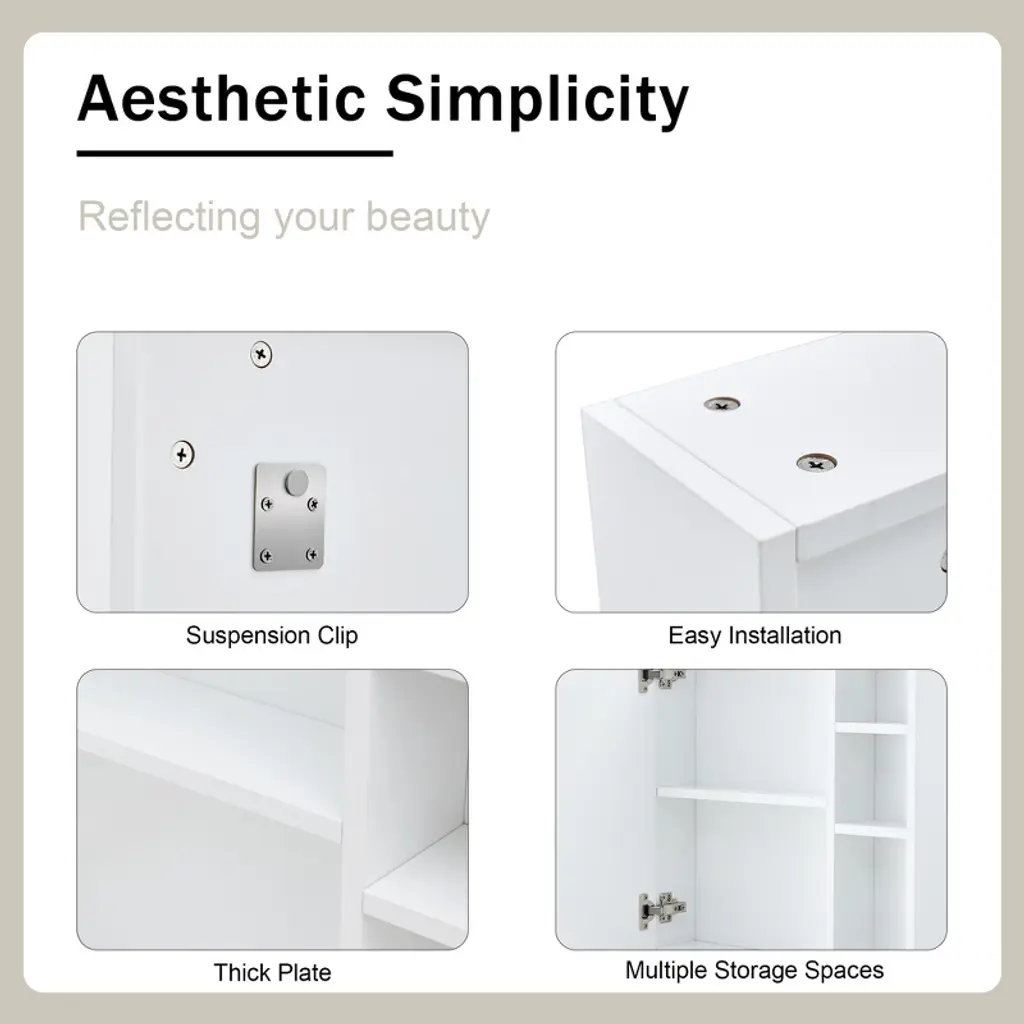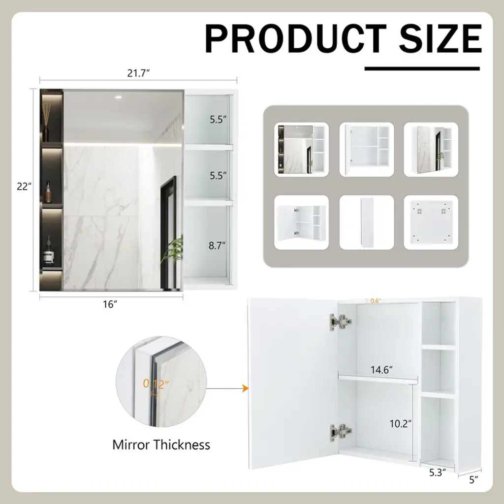 PREMIUM MIRROR: Features a 0.12-inch thick mirror surface providing high-definition, distortion-free reflection for clear viewing and daily grooming needs SMART STORAGE: Combines internal compartments with open shelving design to efficiently organize toiletries, skincare products, and bathroom essentials DIMENSIONS: Measures 21.7 inches wide, 22 inches high, and 5.3 inches deep, perfect for compact bathroom spaces WALL-MOUNTED DESIGN: Space-saving installation keeps your bathroom organized while maximizing vertical storage without taking up counter space PRACTICAL LAYOUT: Features 2 enclosed compartments and 3 open shelves for versatile storage options, maintaining a clean and organized bathroom