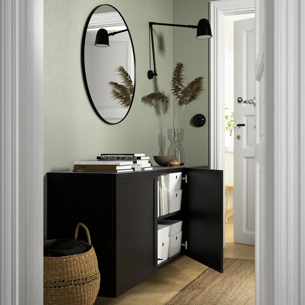 BESTÅ Wall-mounted cabinet combination - black-brown/Hanviken black-brown 70 7/8x16 1/2x25 1/4 ". A wall-mounted solution creates a clean, modern look and makes for easy cleaning of the floor underneath. Adjustable shelves, so you can customize your storage as needed.