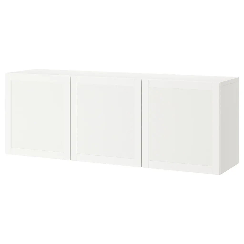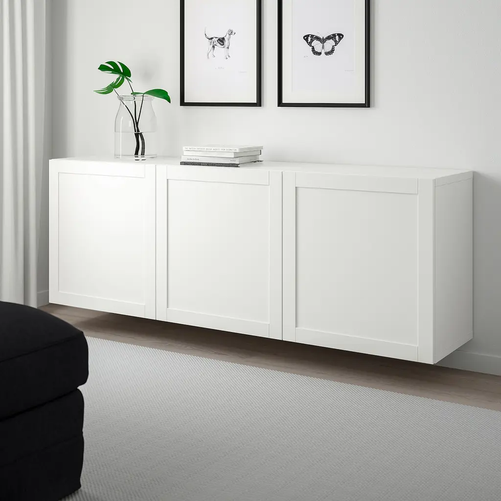 BESTÅ Wall-mounted cabinet combination - white/Hanviken white 70 7/8x16 1/2x25 1/4 ". A wall-mounted solution creates a clean, modern look and makes for easy cleaning of the floor underneath. Adjustable shelves, so you can customize your storage as needed.