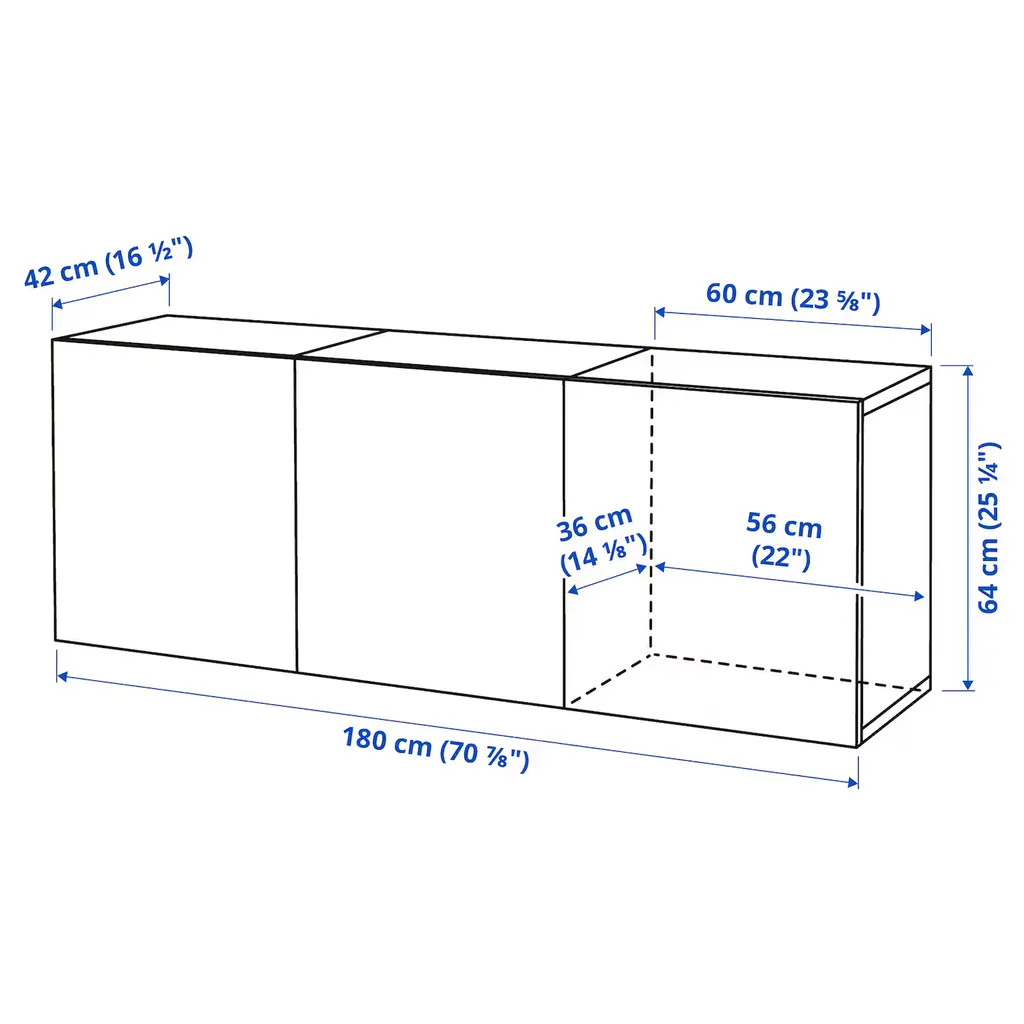 BESTÅ Wall-mounted cabinet combination - white stained oak effect/Lappviken white stained oak effect 70 7/8x16 1/2x25 1/4 ". A wall-mounted solution creates a clean, modern look and makes for easy cleaning of the floor underneath. Adjustable shelves, so you can customize your storage as needed.