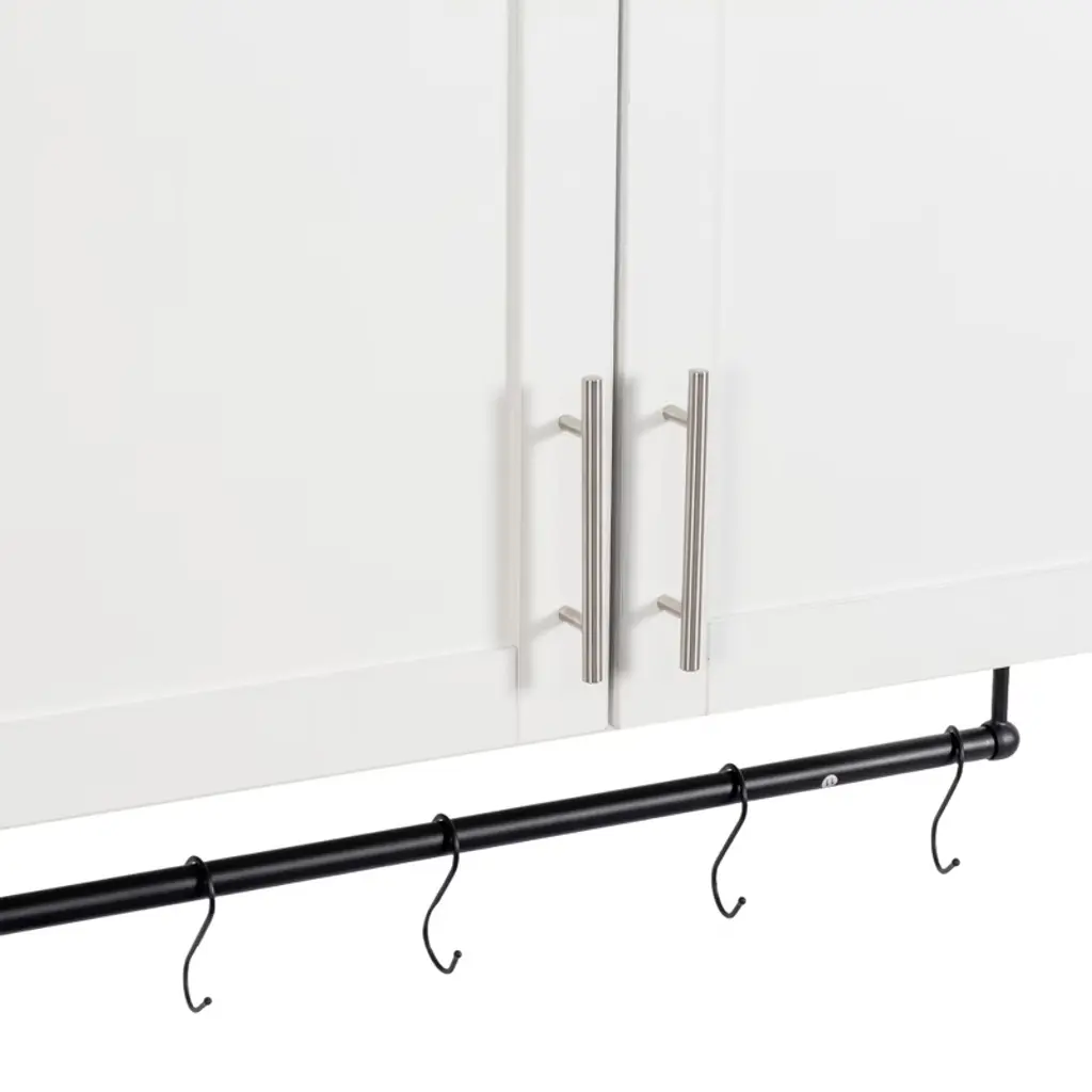 The wall cabinet adopts a closed cabinet and open bottom design, and is equipped with an adjustable shelf, a towel rack, and 5 additional hooks to meet your needs for storing different items.