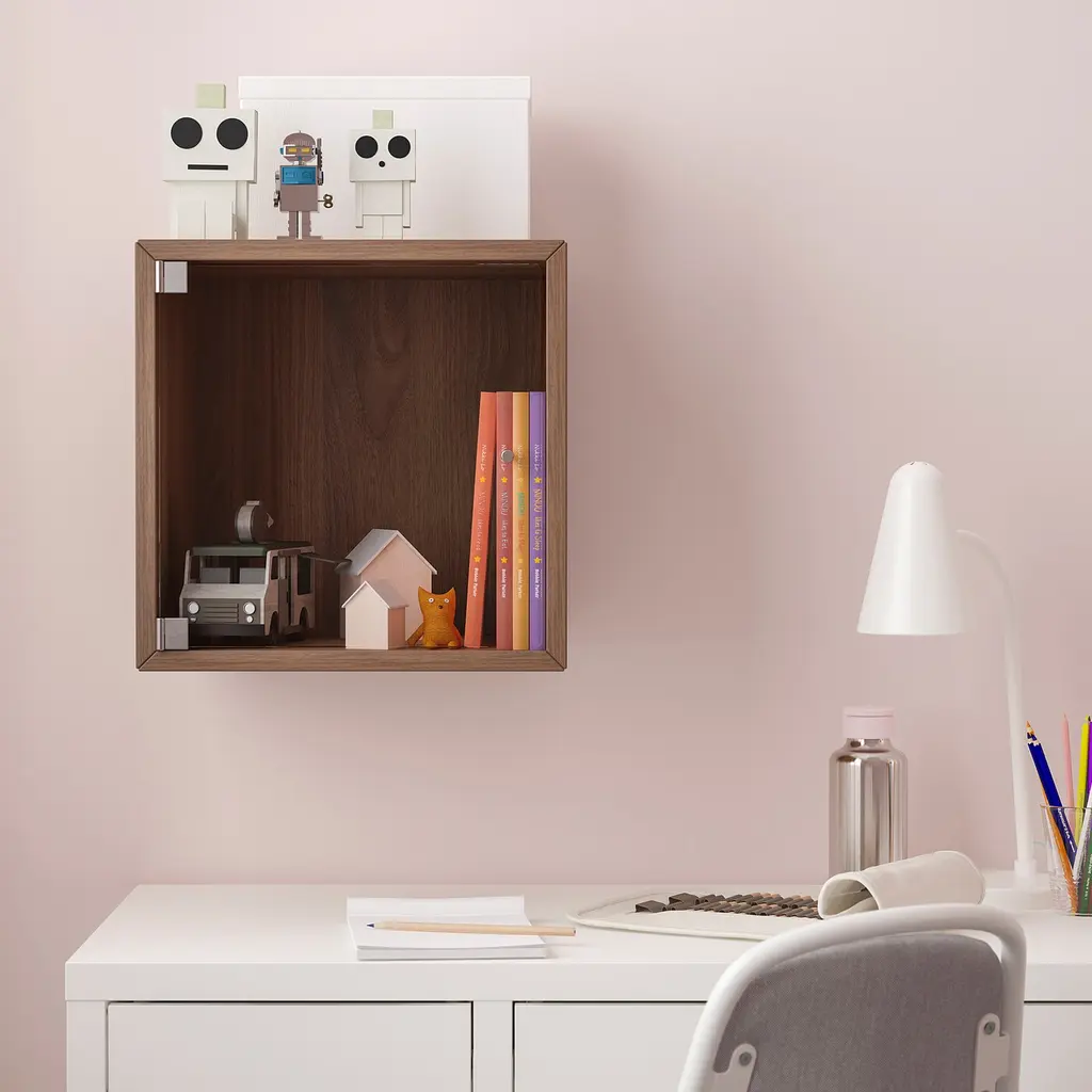 EKET Wall cabinet with glass door - brown walnut effect 13 3/4x13 3/4x13 3/4 ". With wall-mounted EKET, you make the most of the wall area, while freeing up space on the floor. Tempered glass is more impact resistant than ordinary glass and the surface is easy to clean.