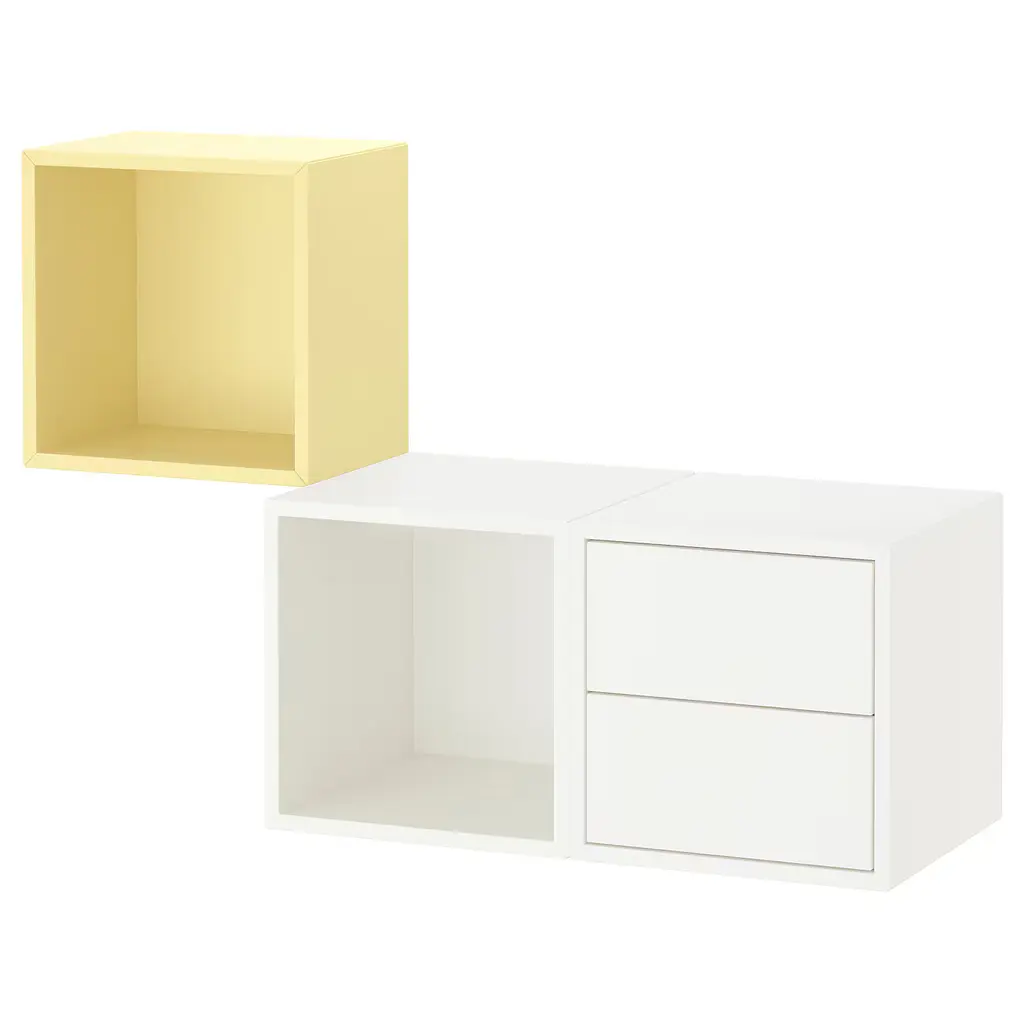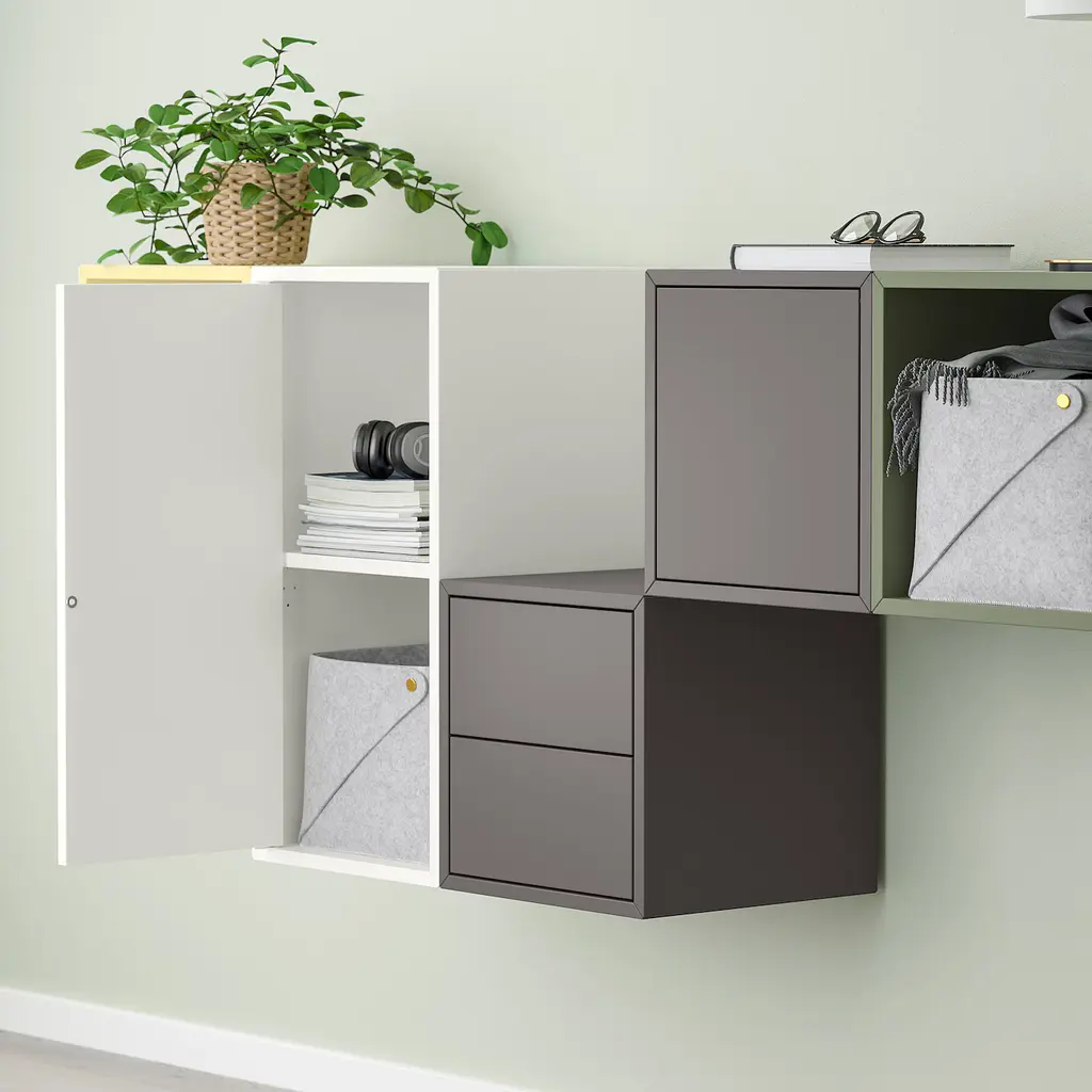 EKET Wall-mounted cabinet combination - white/multicolor 68 7/8x13 3/4x27 1/2 ". With wall-mounted EKET, you make the most of the wall area, while freeing up space on the floor. Hide or display your things by combining open and closed storage. EKET suspension rails for wall mounting are included.