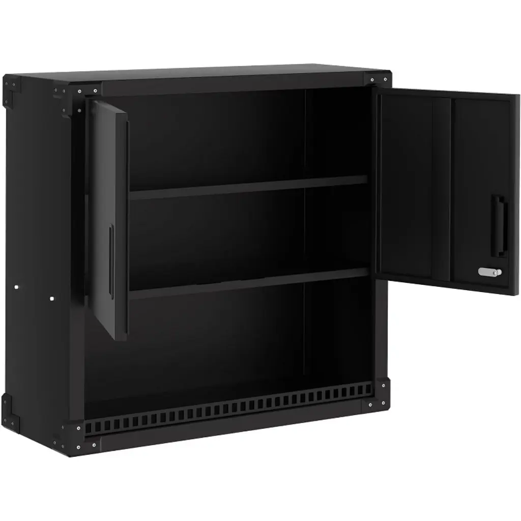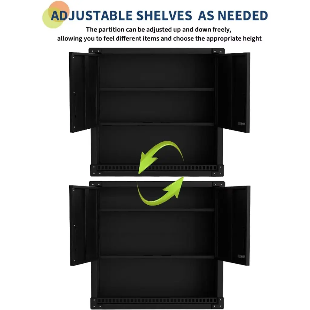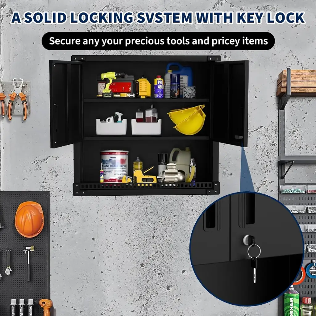 Feature:This heavy-duty steel garage storage wall cabinet provides secure and organized storage for tools and equipment. Designed to be wall-mounted, it saves floor space while offering adjustable shelves for flexible storage. The lockable doors protect valuable items, and the floating design keeps the workspace neat and accessible. Perfect for workshops, garages, kitchens, or warehouses, this cabinet combines durability, security, and space efficiency in one.Package Included:1 × Garage Storage Wall Cabinet with Lock, Adjustable Shelves