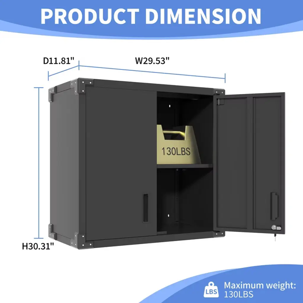 This Munora wall-mounted garage cabinet combines security and flexibility for organized tool storage. The black steel unit (11.81"D x 29.53"W x 30.31"H) features 18-gauge cold-rolled steel construction with a powder-coated finish, resisting rust and wear in garage or utility room environments. Two lockable doors (four keys included) safeguard tools, while two adjustable interior shelves (1" increments) adapt to varying item sizes—remove shelves entirely for tall equipment. The cabinet’s top surface provides additional storage, and pre-drilled mounting holes enable 20-minute installation with the included hardware. Shipped with a 1-year warranty, this cabinet optimizes wall space while delivering industrial-grade durability.