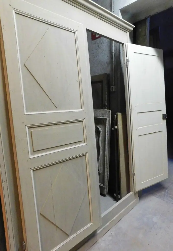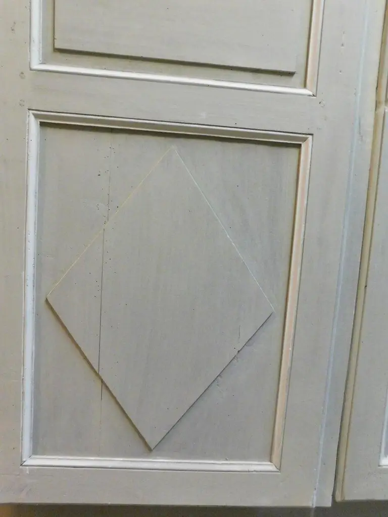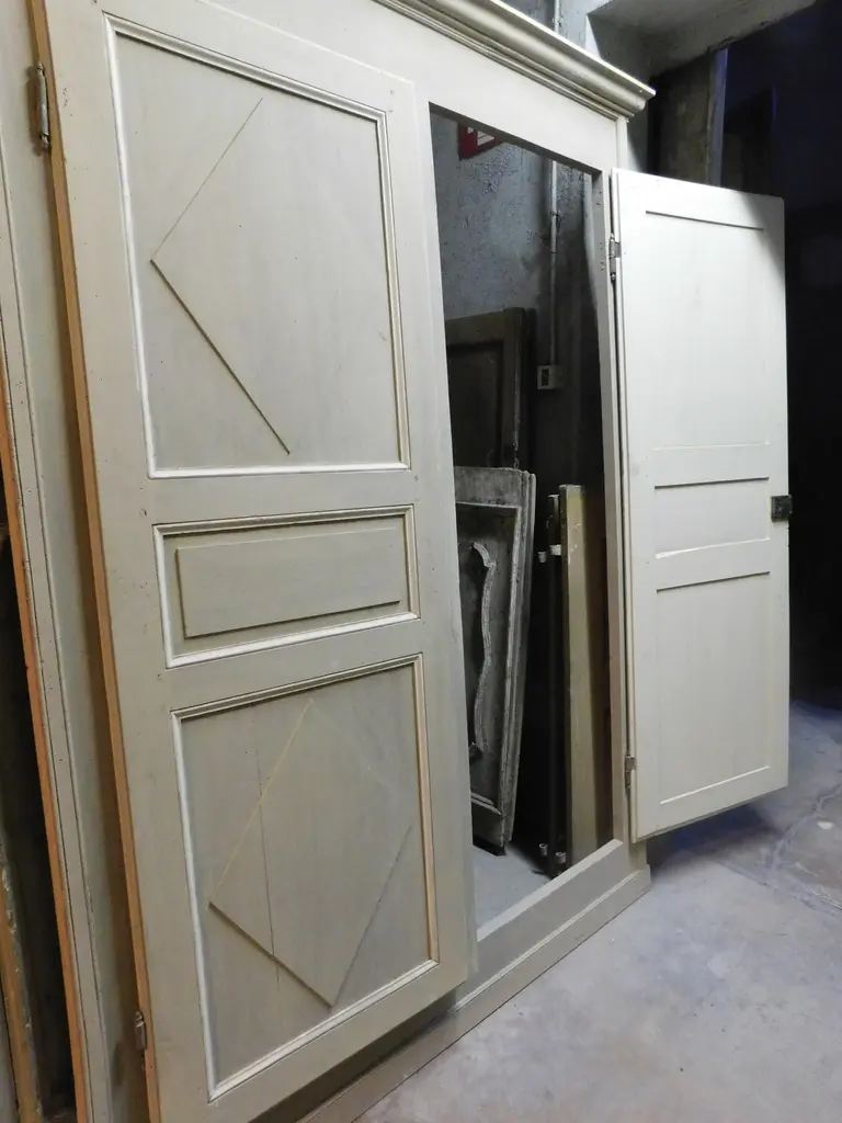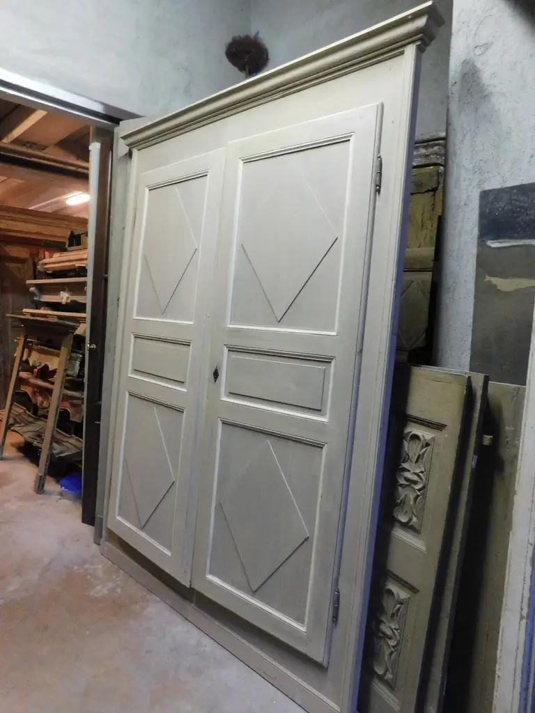 Ancient pair of wall cabinets, lacquered placards, double-winged with carved lozenges and original frame, already conservatively restored, built in the 19th century in Italy.Ideal as built-in wardrobes, beautiful in pairs perhaps in a large office or living room, price for single placards.maximum size cm w 160 (w with hat cm 175) x H 230, door opening dimensions cm w 140 x H 187