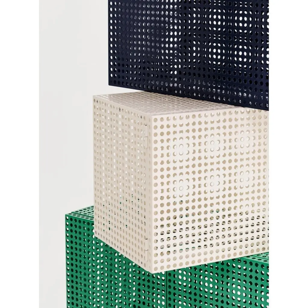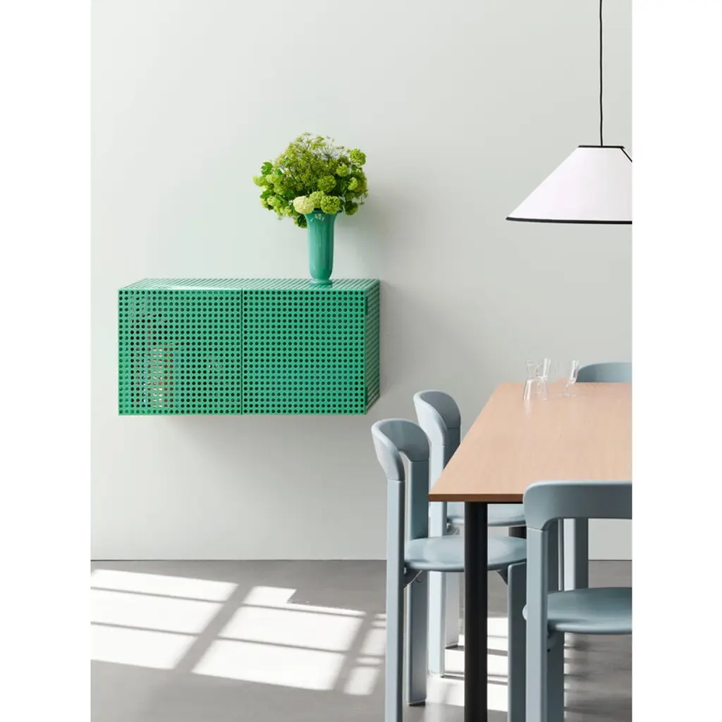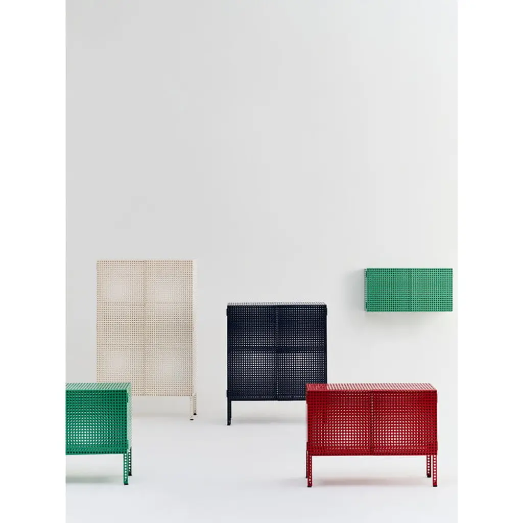 HAY’s Perforated cabinet is a minimalist storage unit that reflects Muller Van Severen’s playful industrial esthetic. The perforated surface protects the contents from dust while offering a subtle, semi-transparent glimpse inside. Made of powder-coated steel, the slim wall-mounted cabinet features two doors that close softly with a magnetic mechanism. The Perforated series includes modern metal cabinets in various sizes and colors, designed to mix and match effortlessly – both with each other and with different styles of furniture. The perforated cabinets are ideal for organizing items in the hallway, office or kitchen, and also work beautifully as eye-catching storage in the living room. Their durable construction makes them suitable for public spaces as well.