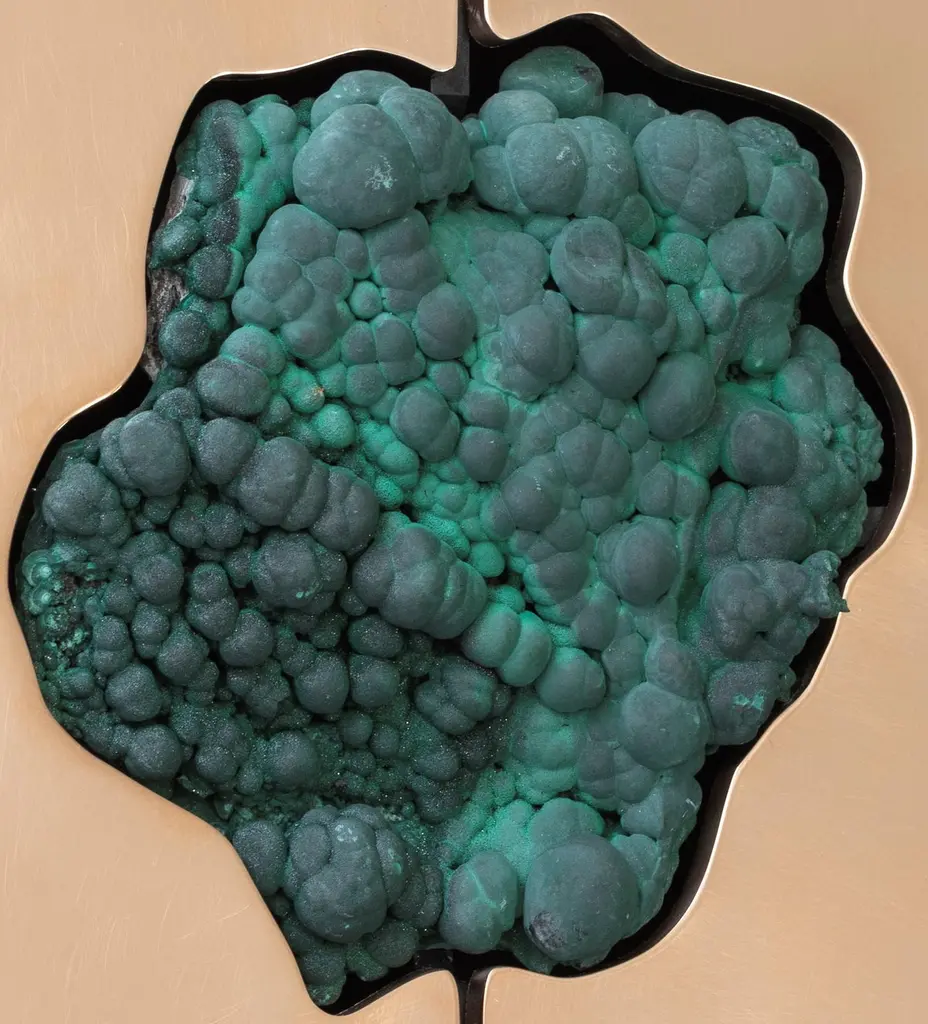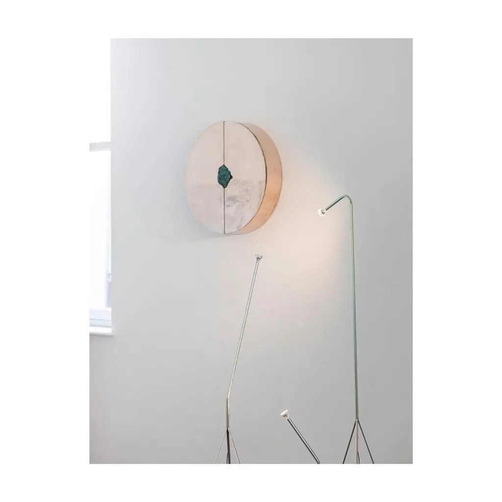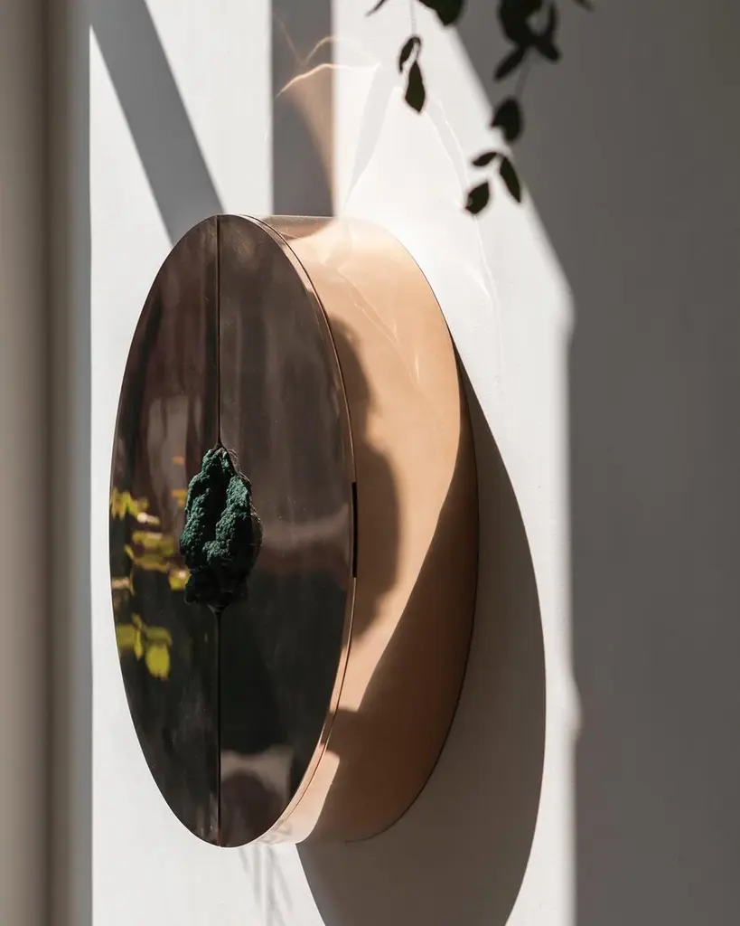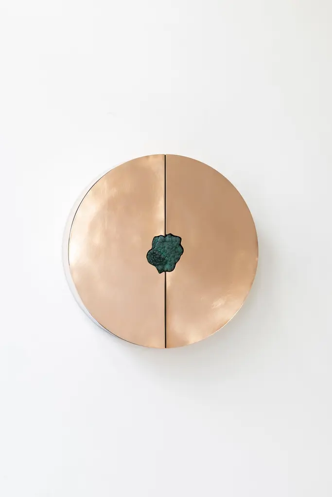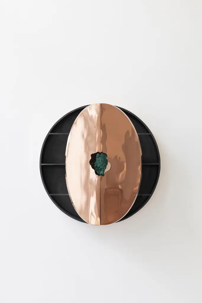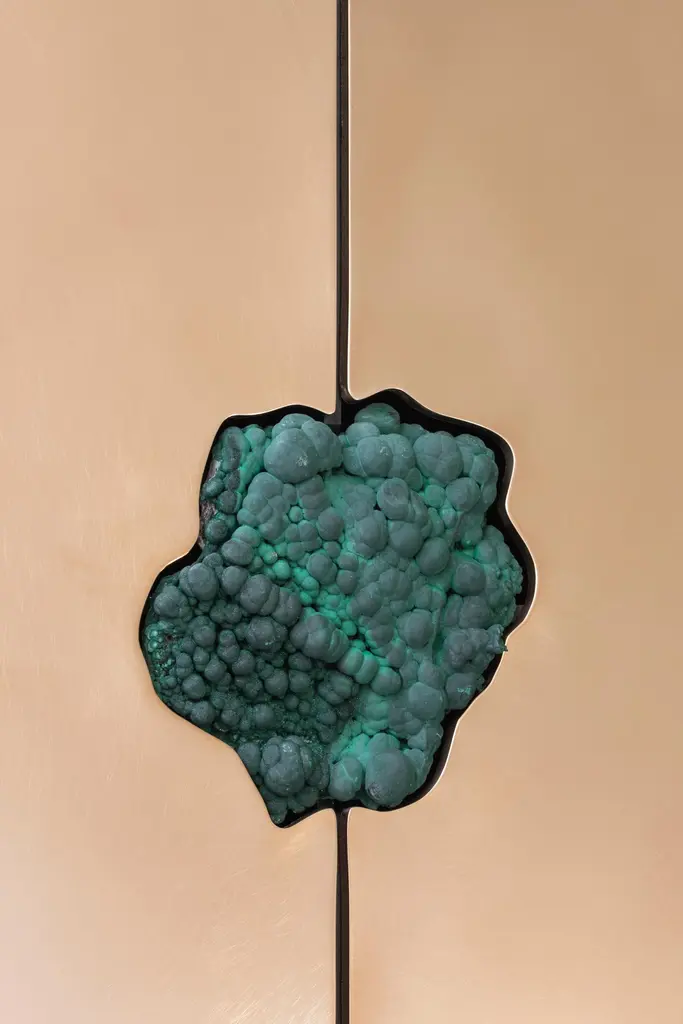 Wall cabinet with Malachite by Pierre De Valck.Dimensions: W 90 x D 22 x H 90cmMaterials: Polished bronze with Malachite.Weight: 45 kg.Each piece is unique.Pierre De Valck (1991) born in Brussels, is a Ghent-based designer with a childhood fascination for archeology and collecting historical artefacts. His furniture attempts to harness the power of ancient geological processes in a contemporary bodice. Modern antiquities that allow the rediscovery of an ancestral past.Pierre De Valck manually encrusts each piece of furniture with unique minerals and stones of exceptional historical value. Leaving the minerals untouched, the mere functional is transcended, rendering the pieces both unique and authentic testimonies of our collective memory.