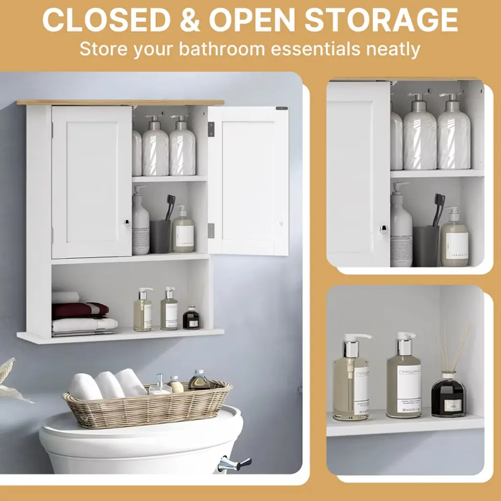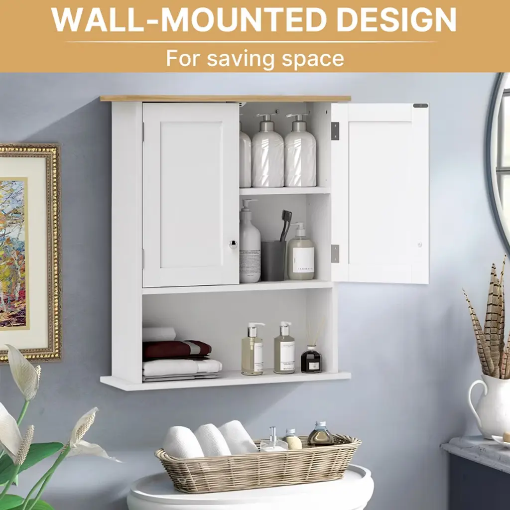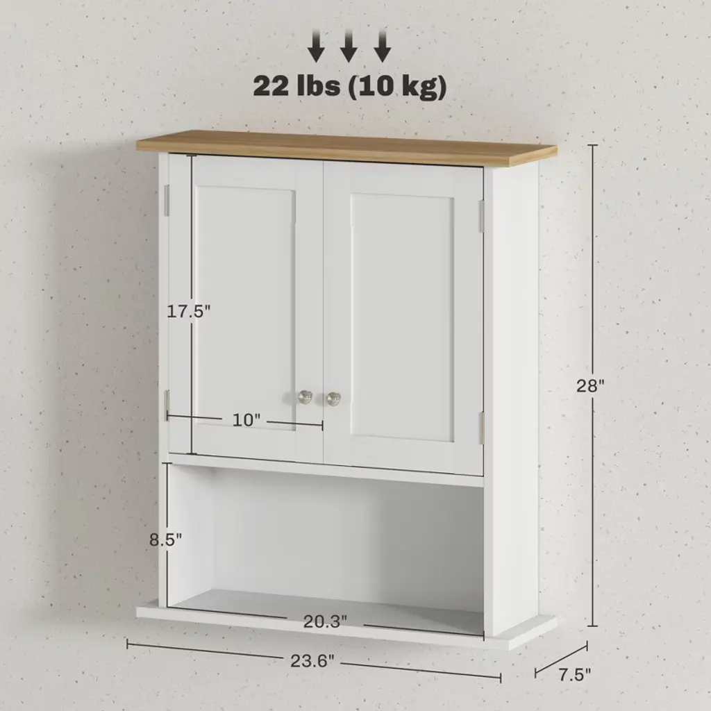This wall-mounted bathroom cabinet is designed for small spaces. It cleverly utilizes the wall or the space above the toilet/sink to avoid occupying the floor area, making the bathroom tidier. The double-layer structure design has a closed storage cabinet on the upper layer, which is dust-proof and moisture-proof; the lower layer has an open shelf for easy access to commonly used items. The internal shelf is adjustable to flexibly adapt to toiletries of different heights. It uses moisture-proof medium-density fiberboard, with a modern and simple white finish and oak-colored countertop, which is durable and beautiful.