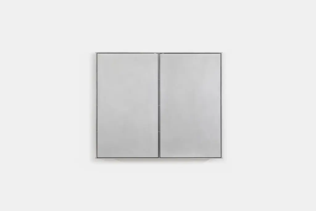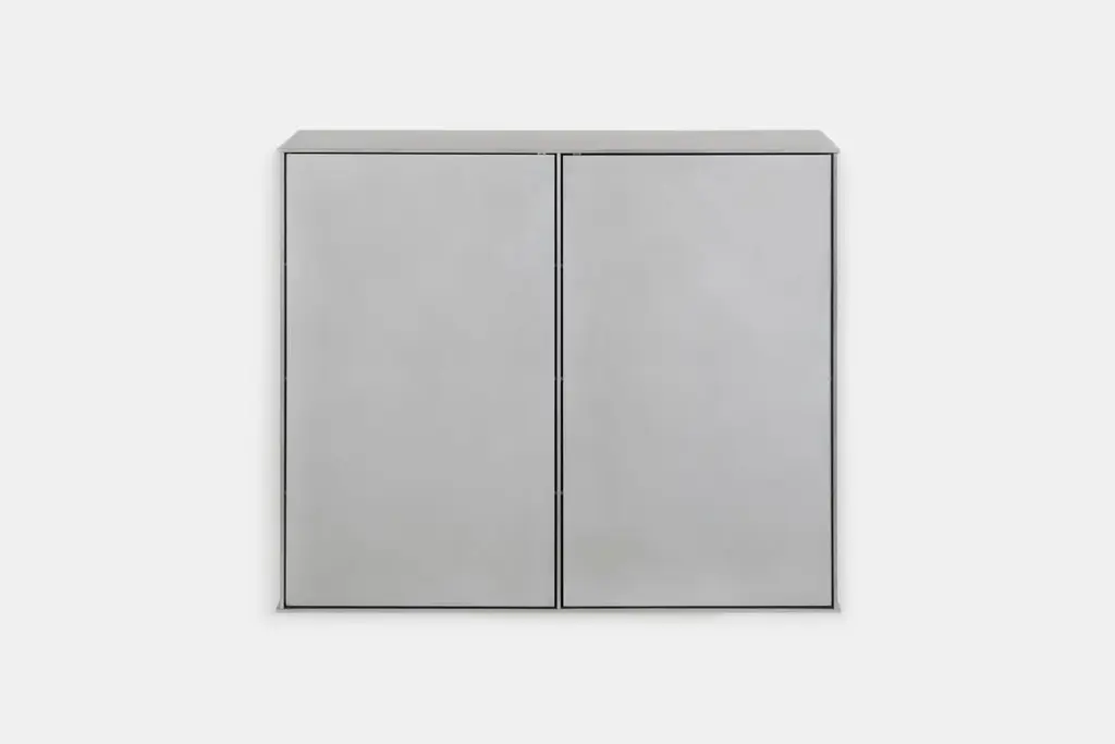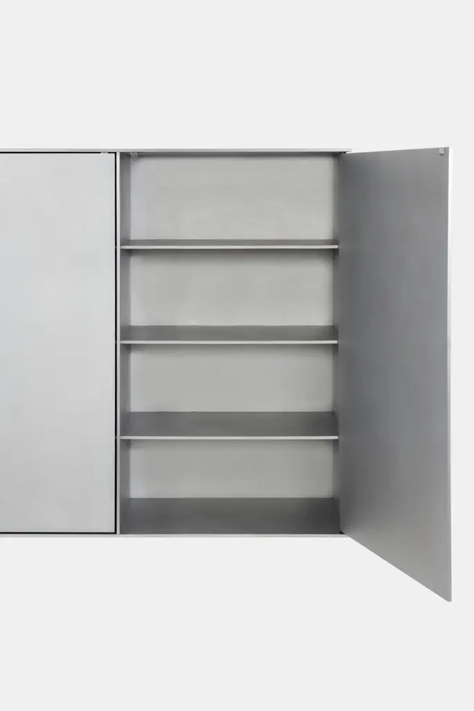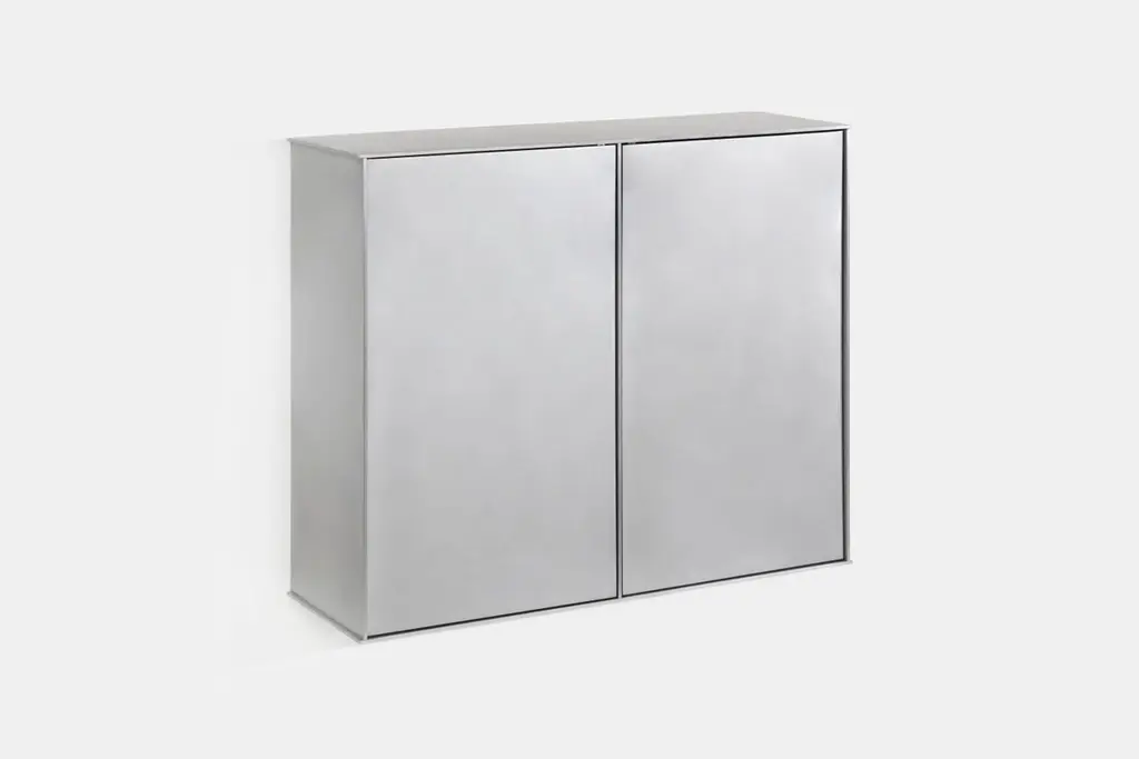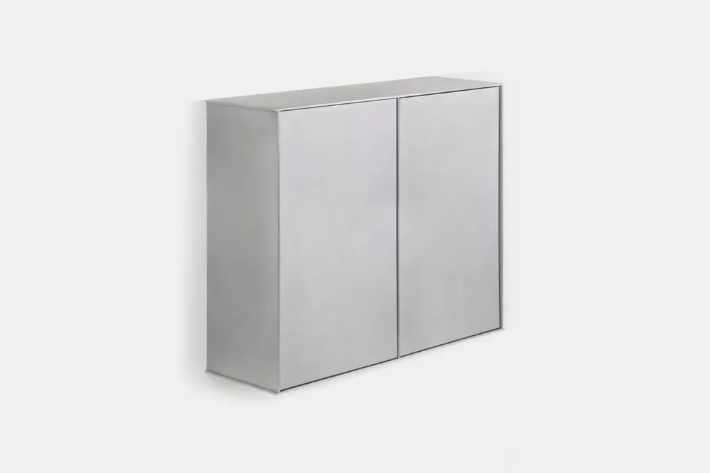 The SC wall-mounted cabinet by Jonathan Nesci is produced in cut and machined aluminum with a waxed finish. The quarter-inch thick doors are set back a quarter-inch and pivot on a spring-loaded stainless pin set on the edge. The doors open with push-to-open Blum hardware. Custom variations available upon request.